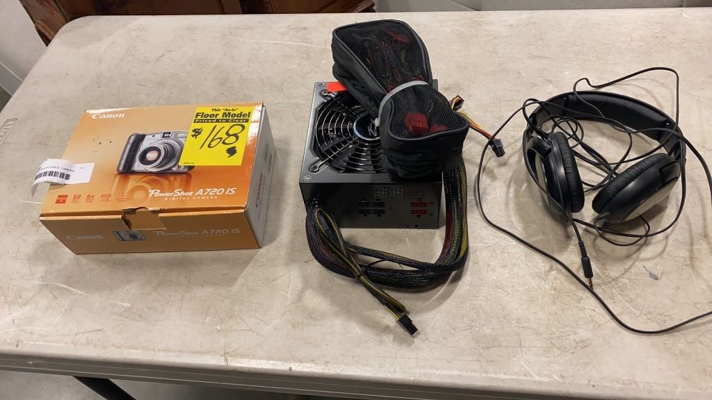 SENNHEISER HEADPHONES, CANOPN POWERSHOT DIGITAL CAMERA AND 500 WATT COMPUTER POWER SUPPLY