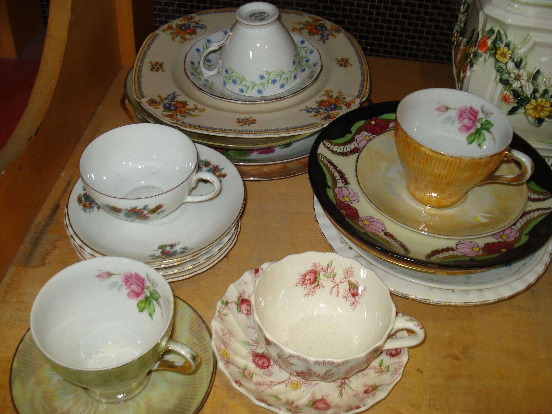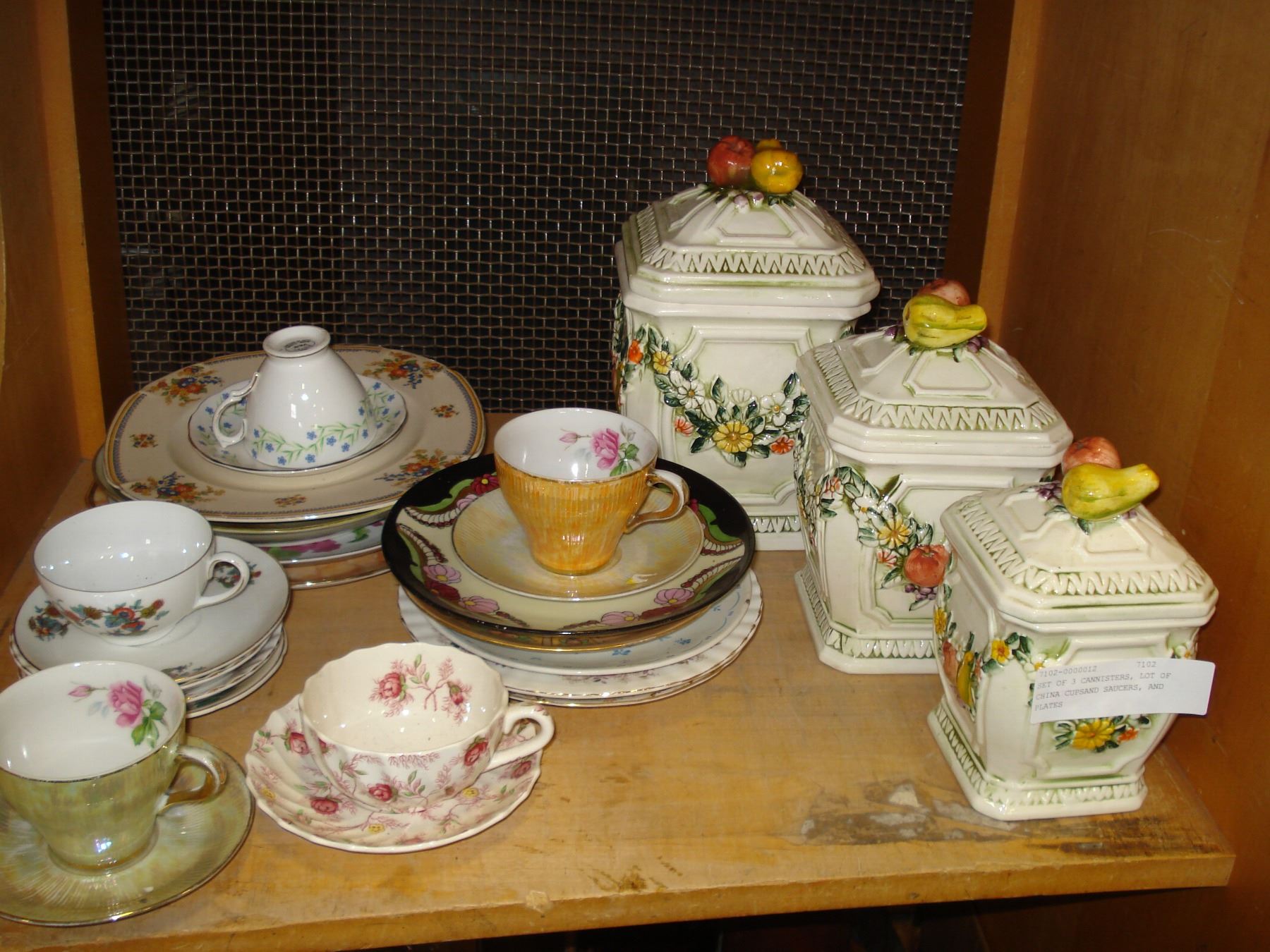 SET OF 3 CANNISTERS, LOT OF CHINA CUPSAND SAUCERS, AND PLATES
