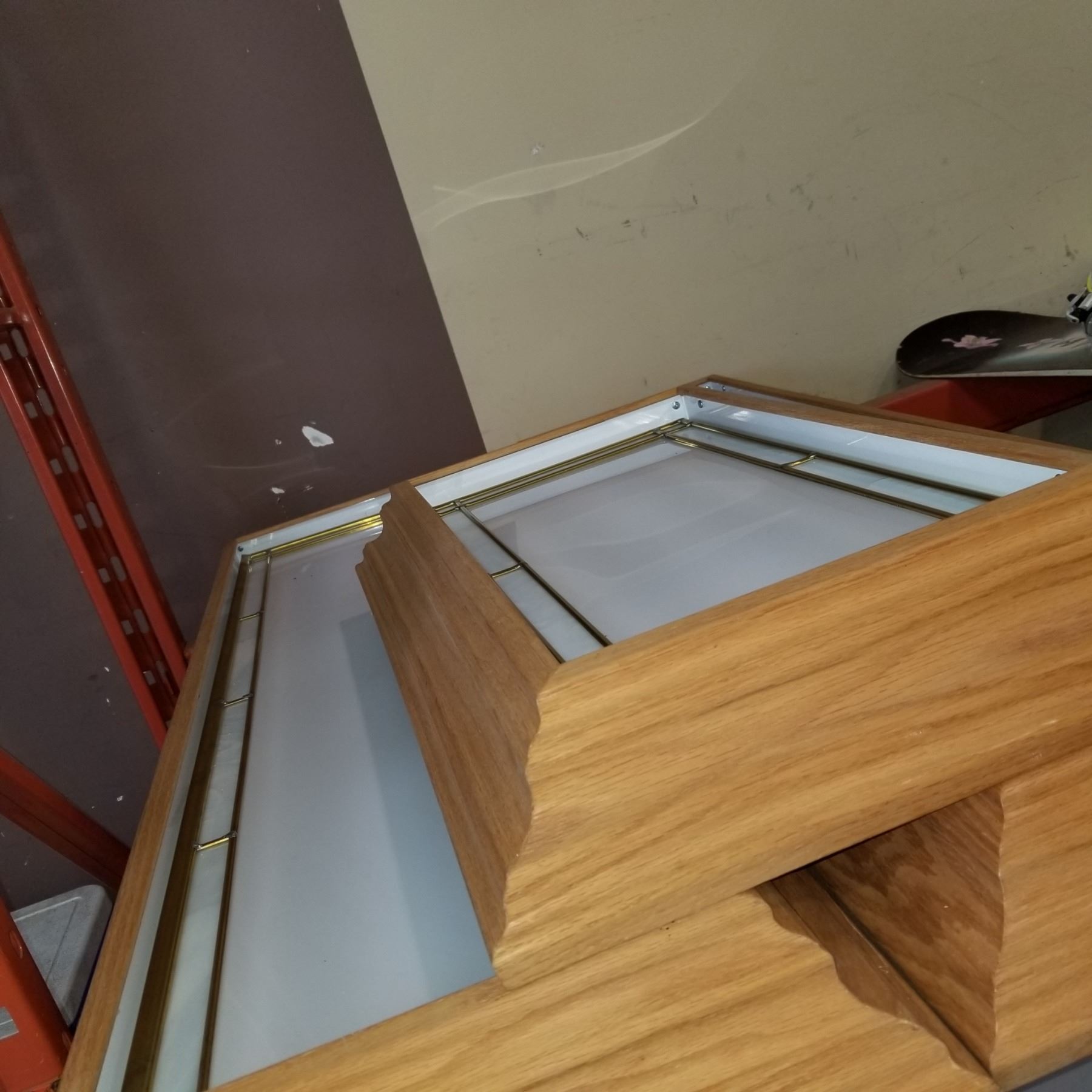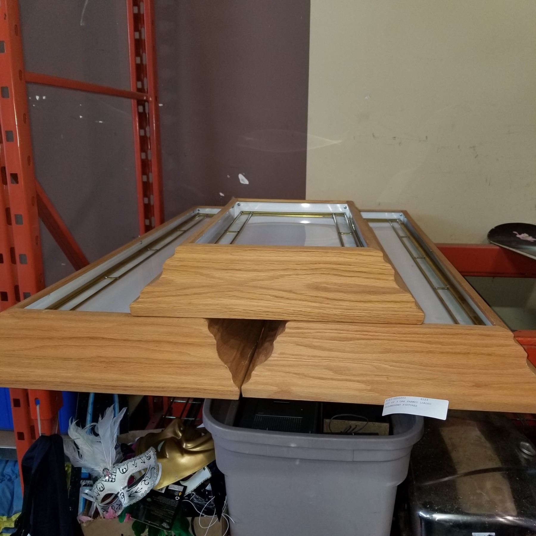 SET OF 3 OAK FRAMED LEADED FLOURESENT FIXTURES