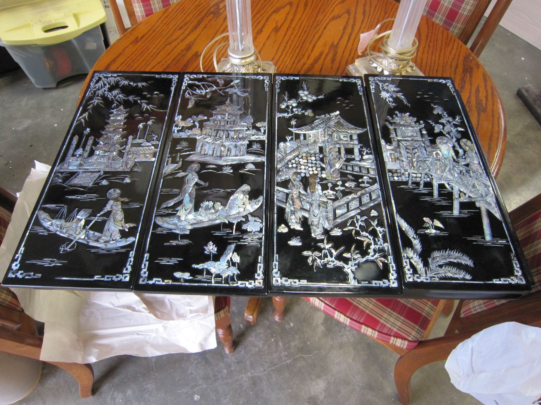 SET OF 4 EASTERN LAQUOR MOTHER OF PEARL WALL HANGINGS