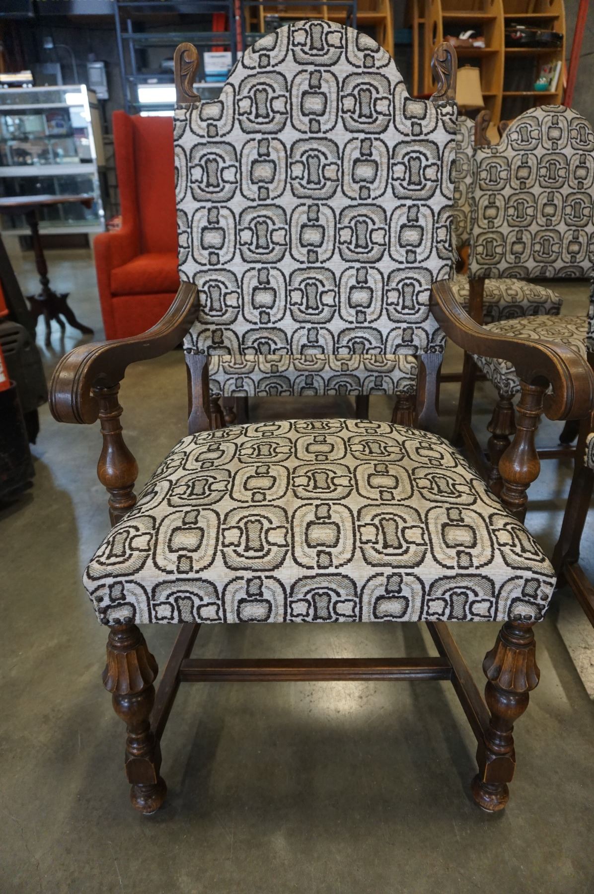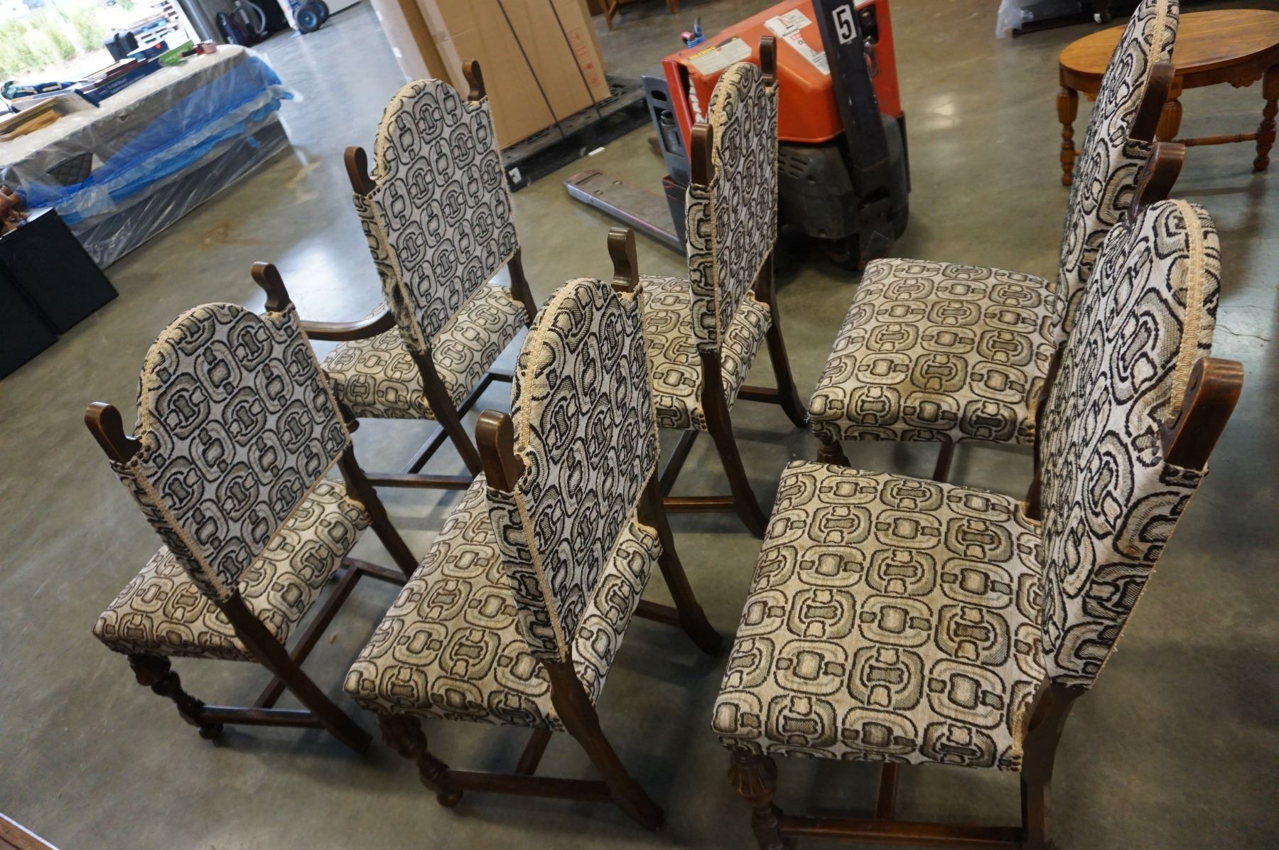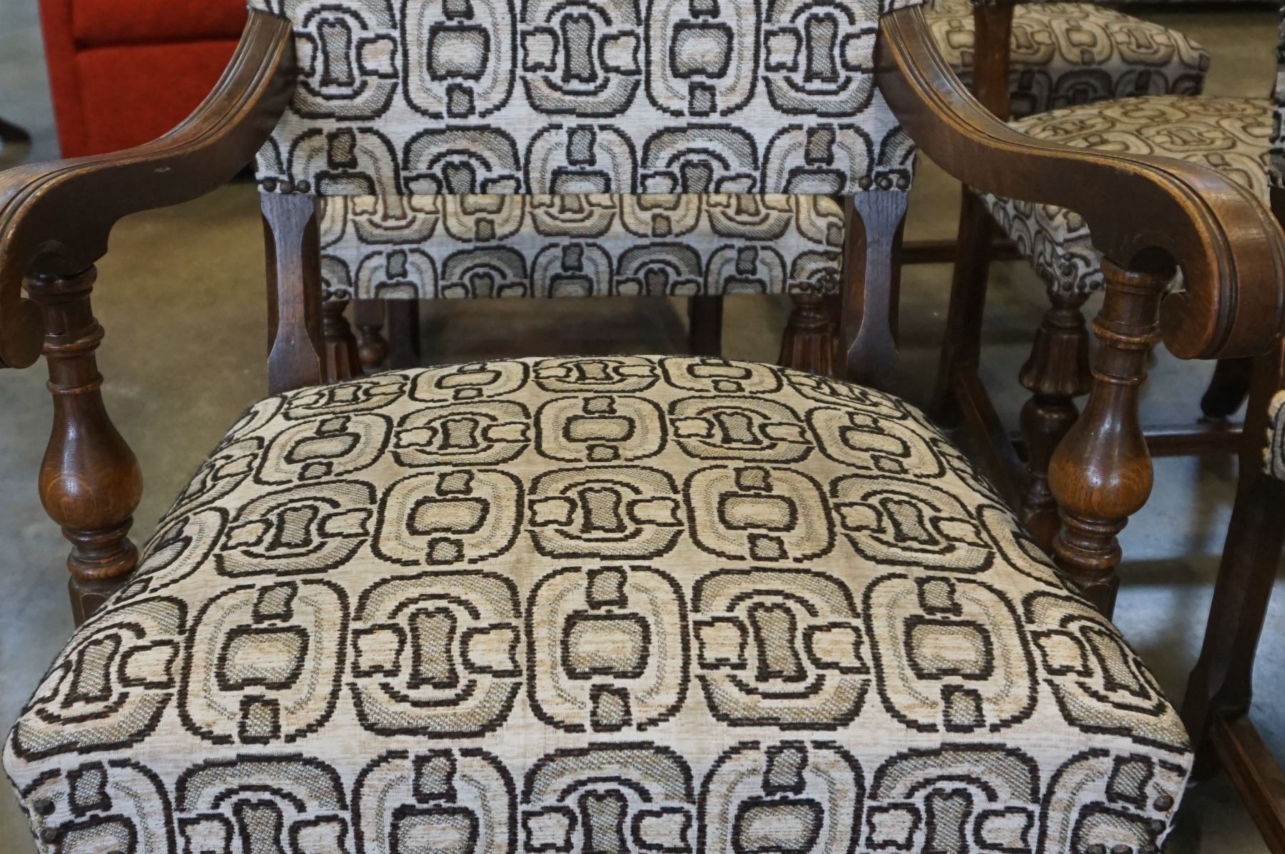 SET OF 6 ANTIQUE OAK AND UPHOLSTERED DINING CHAIRS