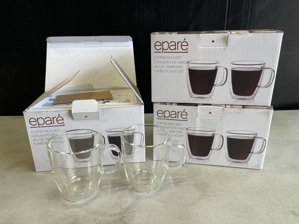 SET OF 6 NEW EPARE 12OZ COFFEE MUG SET, DUAL WALL INSULATED GLASS RETAIL $54 EACH, 3 SETS OF 2, TOTAL $162