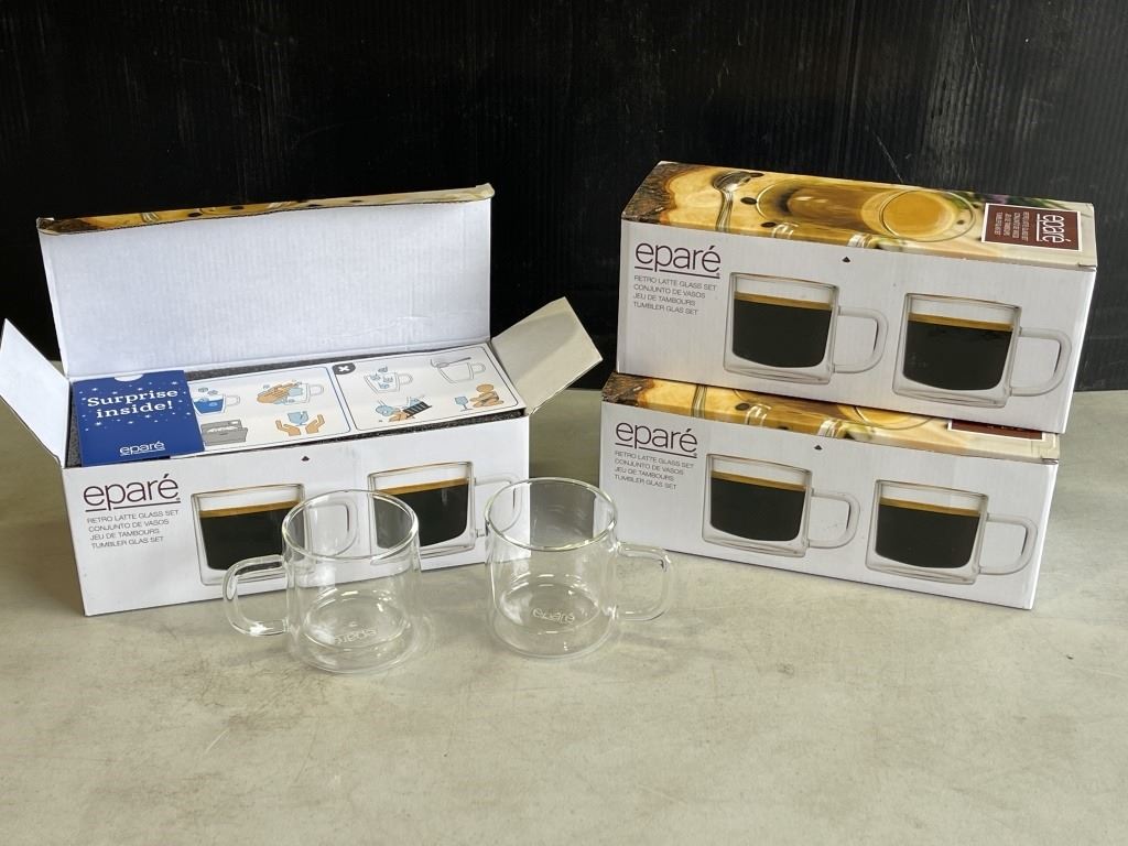 SET OF 6 NEW EPARE RETRO LATTE GLASS SET, DUAL WALL INSULATED GLASS RETAIL $46 EACH, 3 SETS OF 2, TOTAL $138