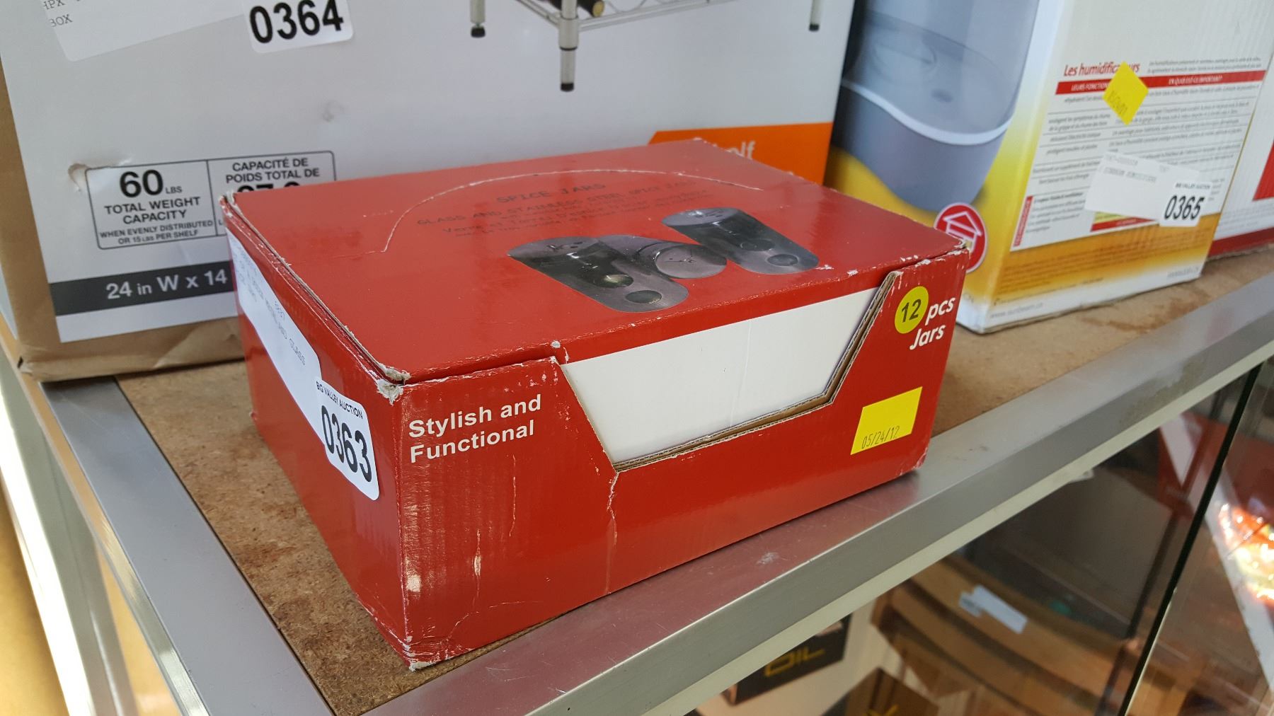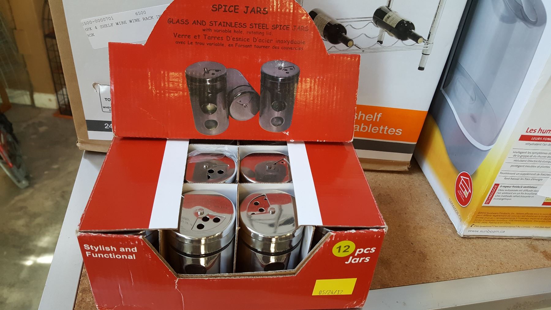 SET OF A DOZEN METAL AND GLASS SPICE JARS