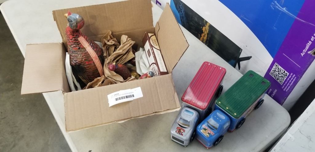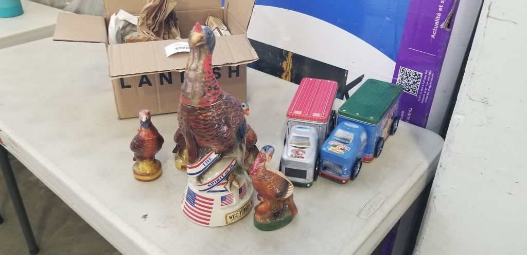 SET OF ANTIQUE LIQUOR DECANTERS , EMPTY, VINTAGE CAPRET KNIFE, 2 TRUCK TINS