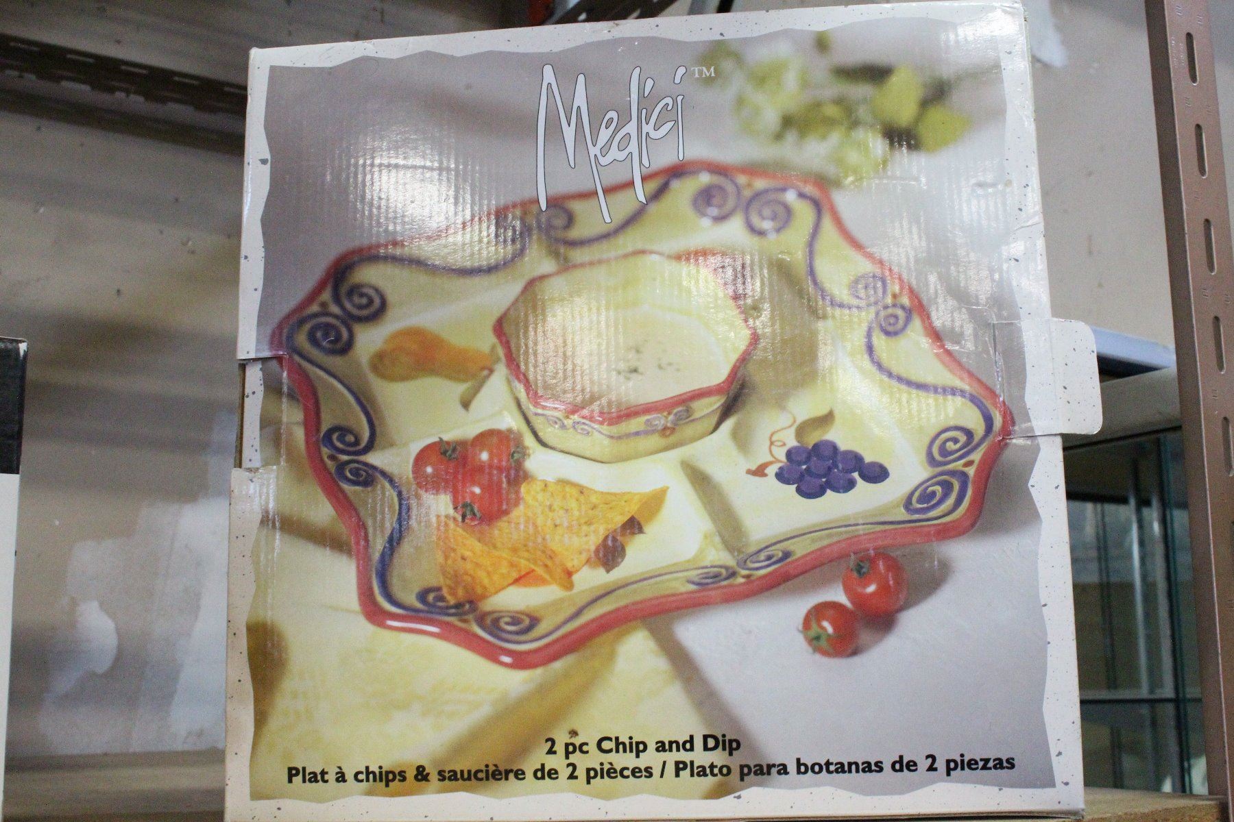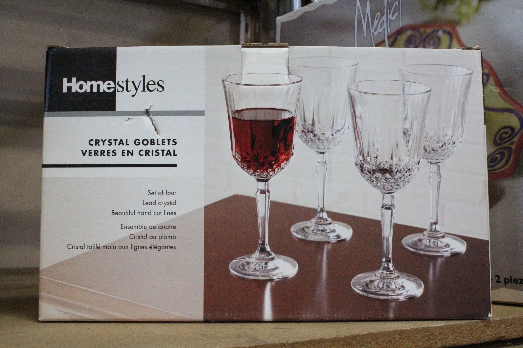 SET OF FOUR CRYSTAL GOBLETS AND TWO PIECE CHIP AND DIP SET