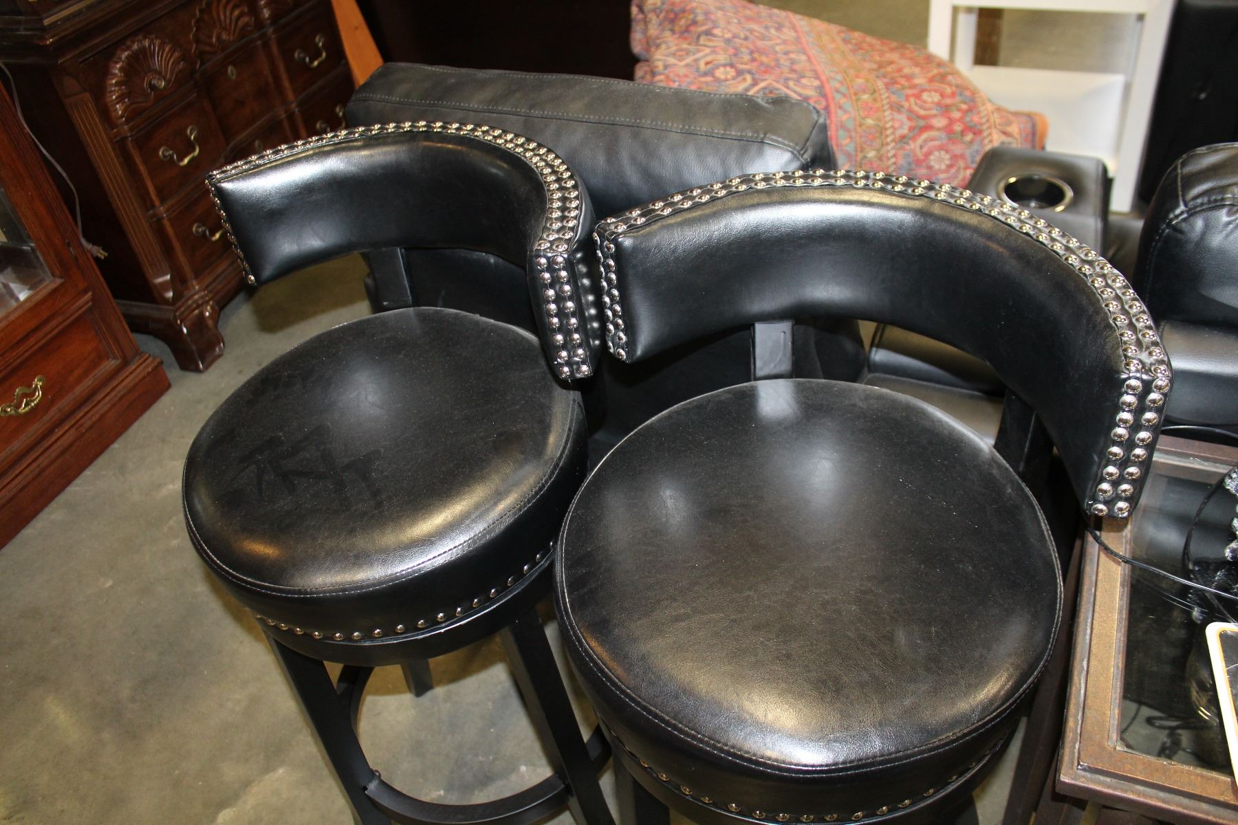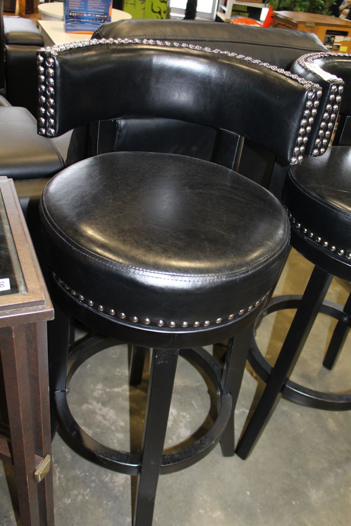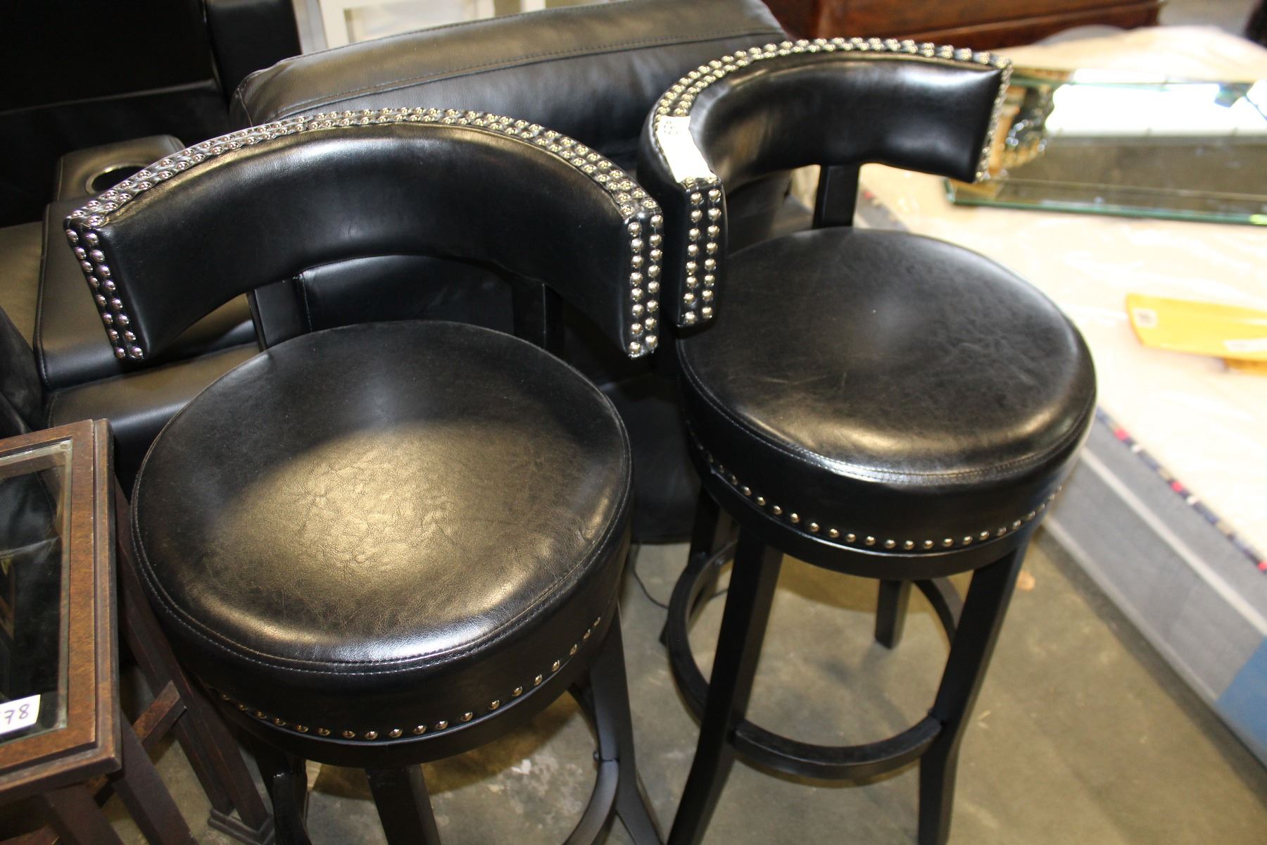 SET OF FOUR HOME ELEGANCE BLACK LEATHER WITH NAILHEAD SWIVEL BAR HEIGHT BARSTOOLS RETAIL $249 EA