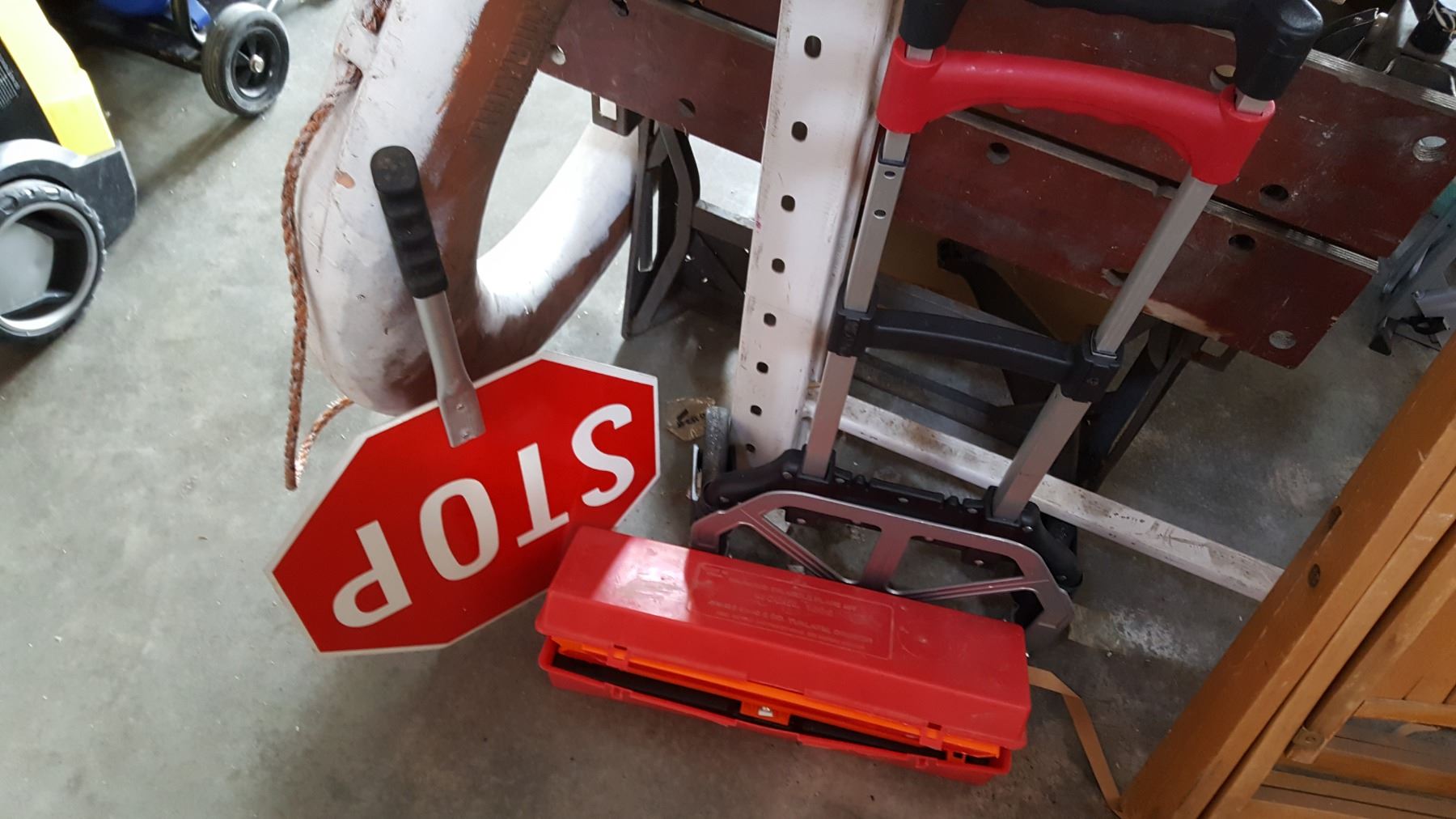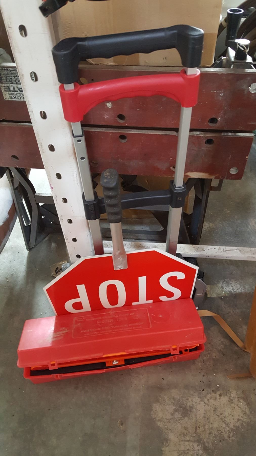 SET OF ROAD FLARES, STOP/SLOW SIGN, AND FOLDING DOLLY