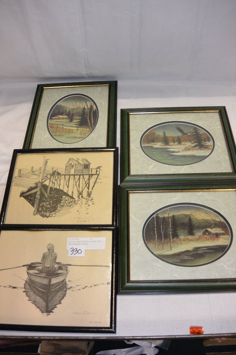 SET OF THREE WINTER PRINTS AND TWO FISHING PRINTS