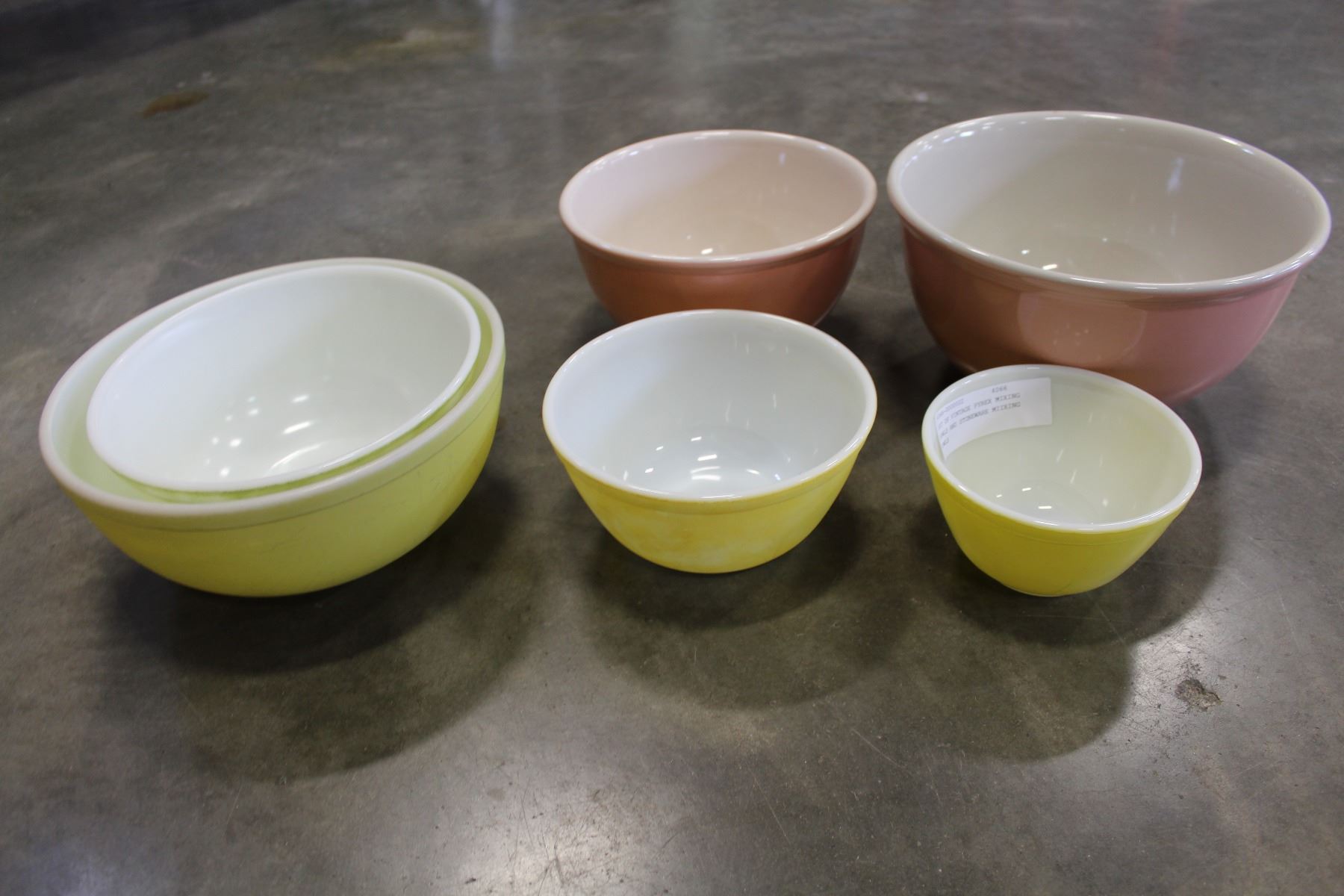 SET OF VINTAGE PYREX MIXING BOWLS AND STONEWARE MIIXING BOWLS