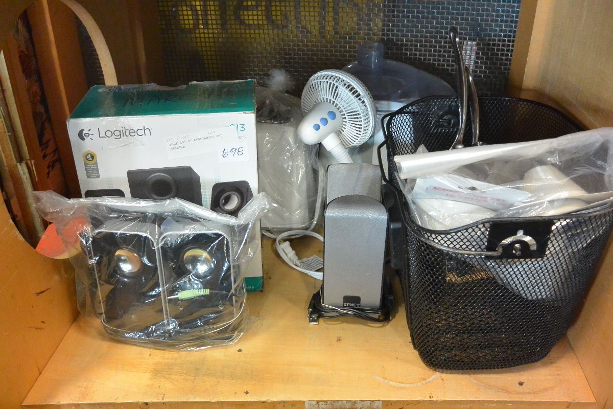 SHELF LOT OF APPLIANCES AND SPEAKERS