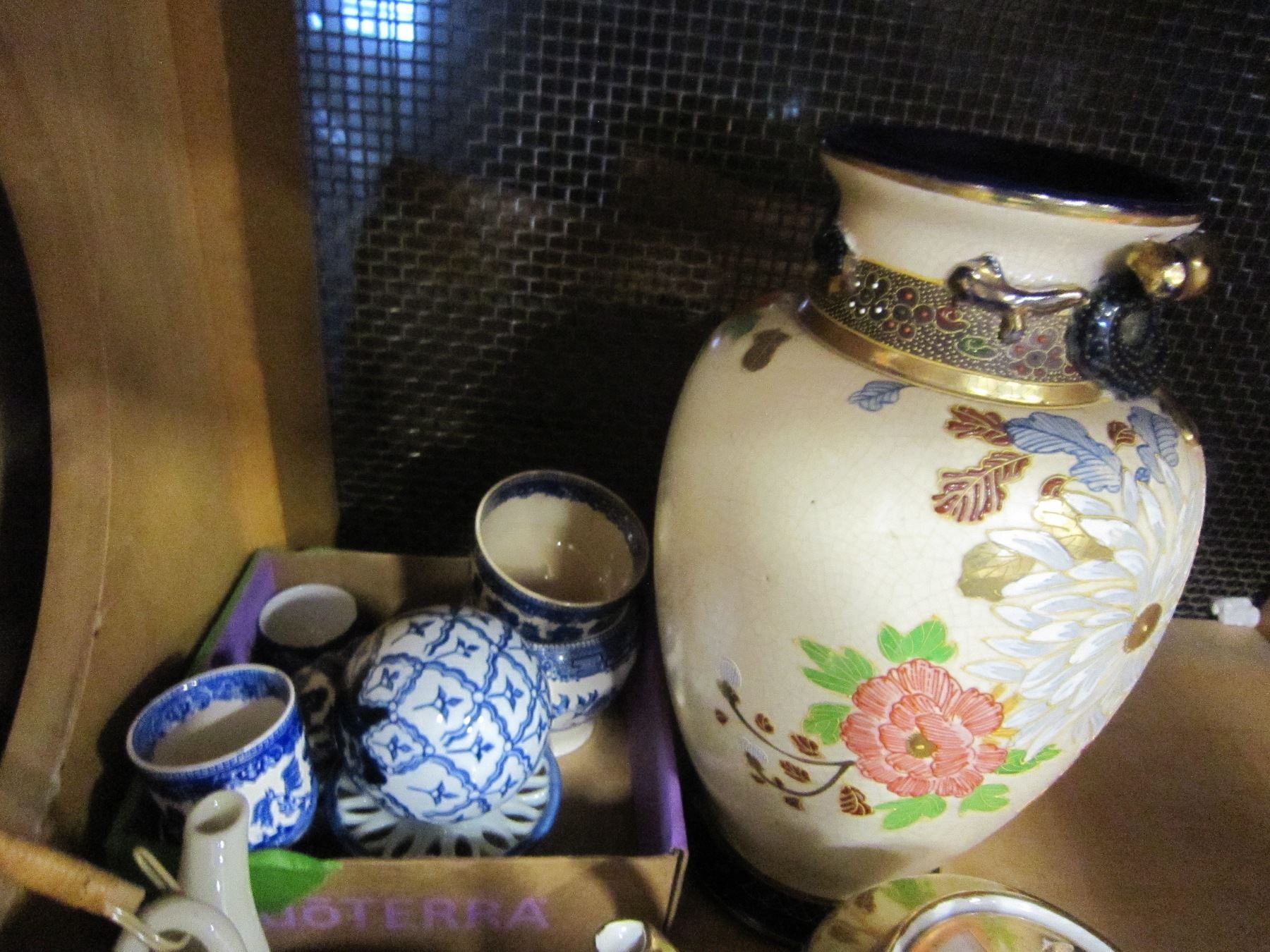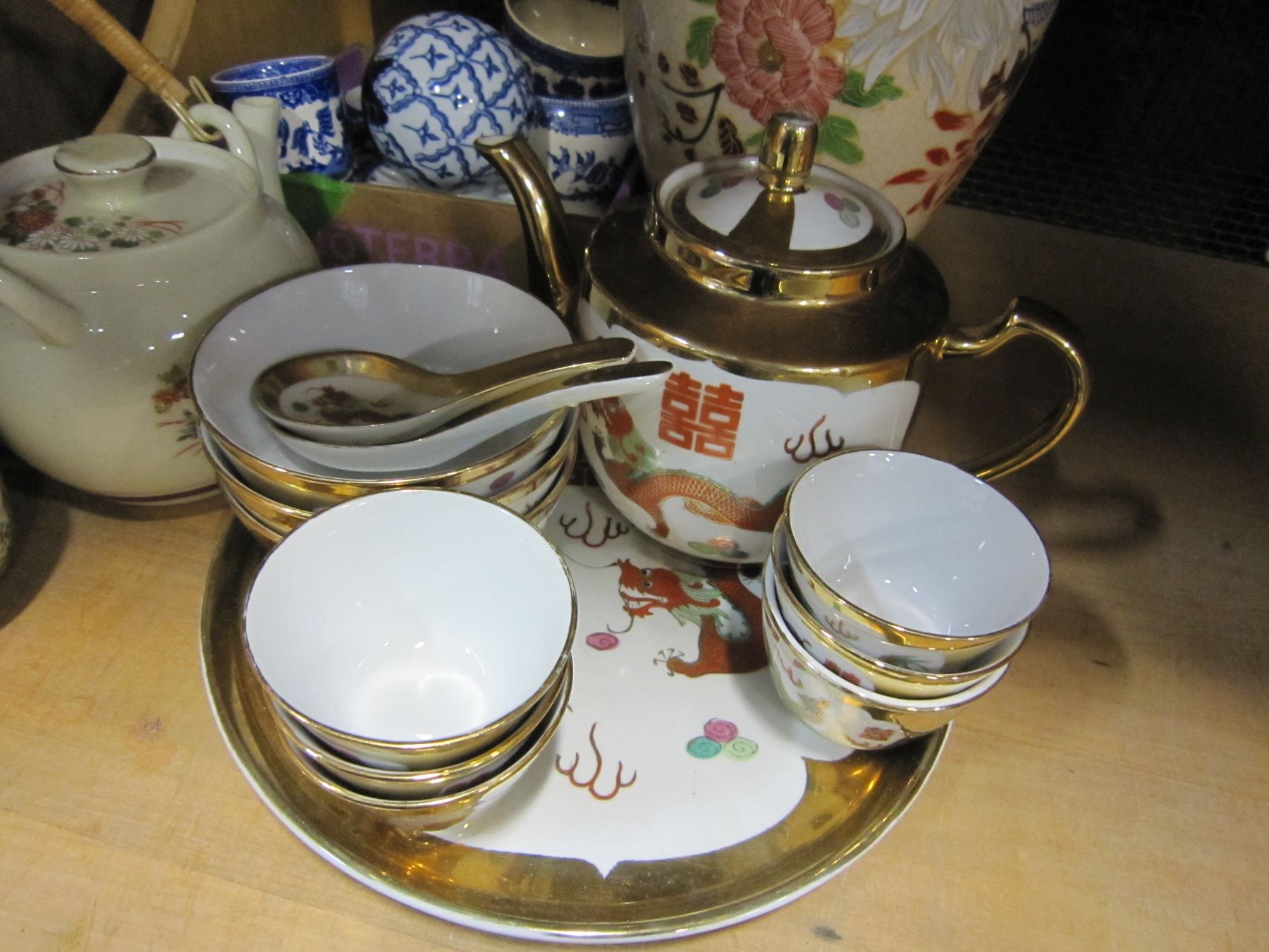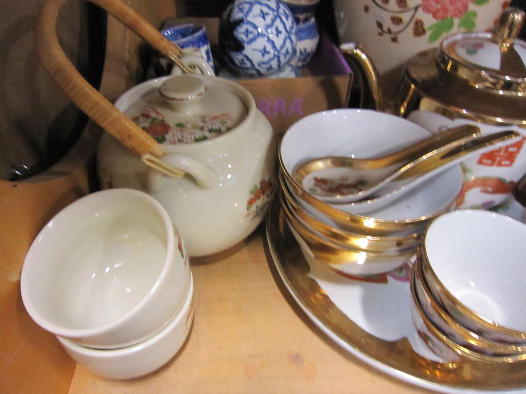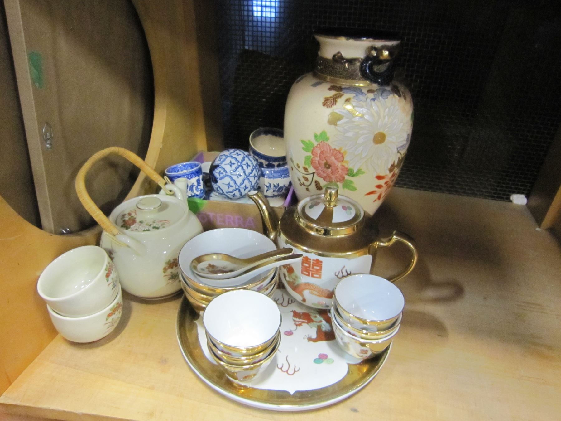 SHELF LOT OF ASAIN TEA SET AND VASE