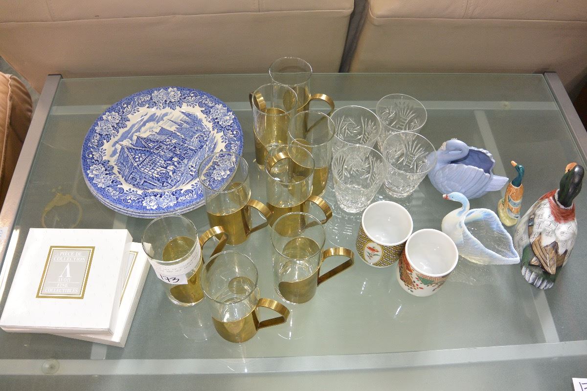 SHELF LOT OF COLLECTIBLE PLATES AND HOT DRINK GLASSES