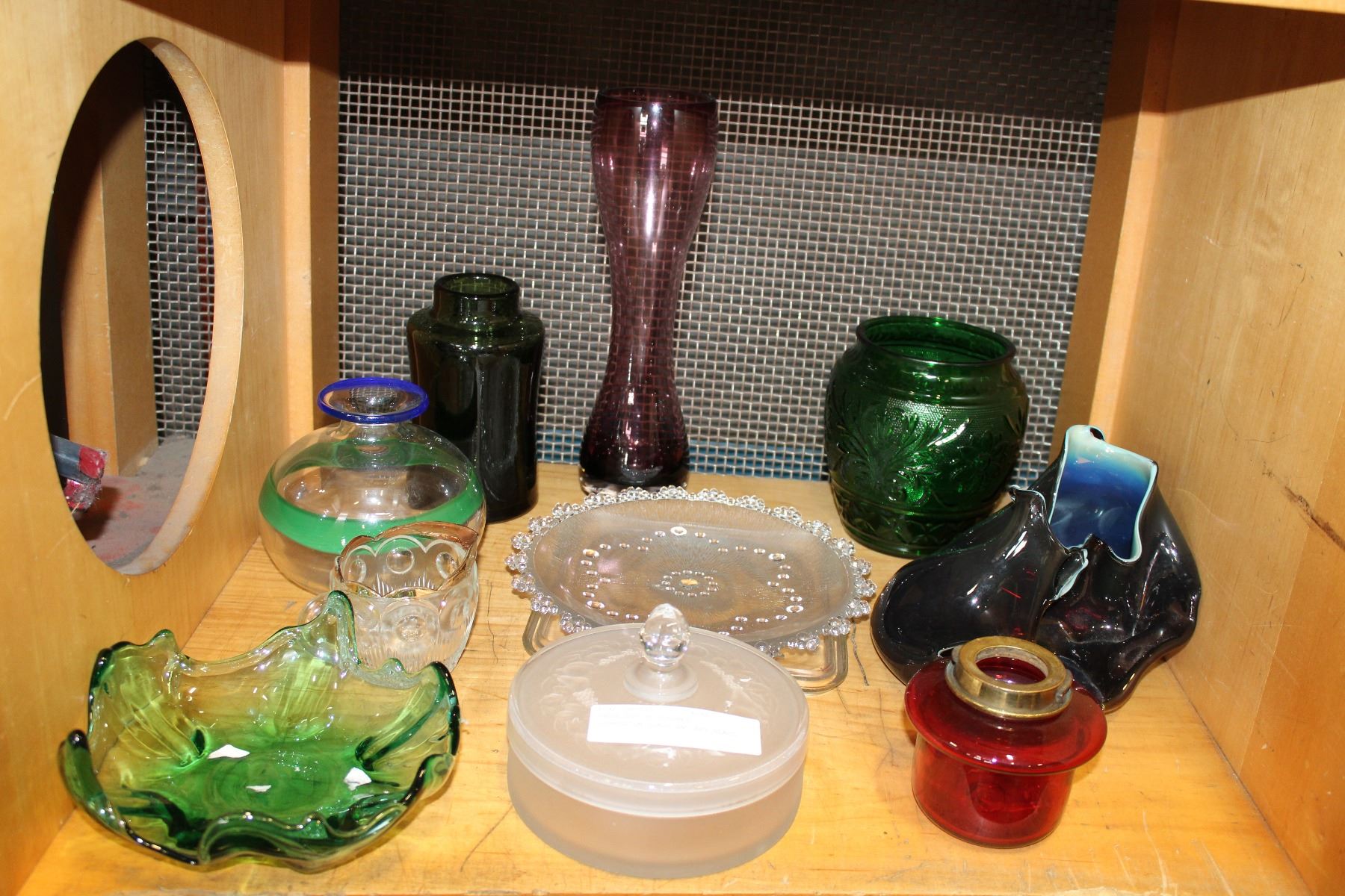 SHELF LOT OF COLORED DEPRESSION GLASS AND ART GLASS