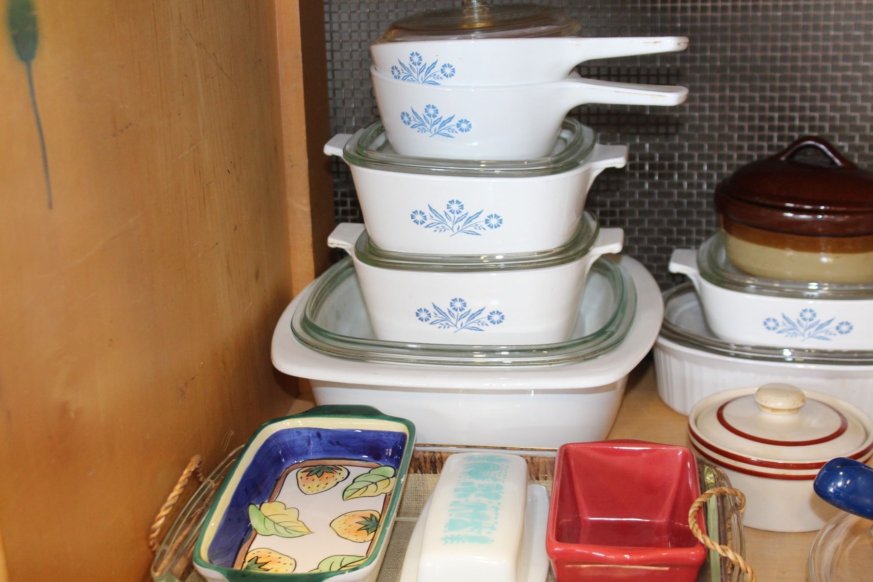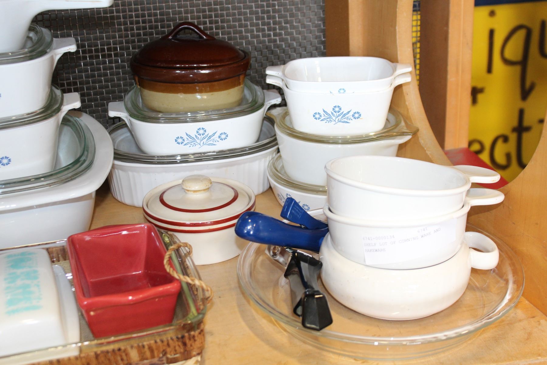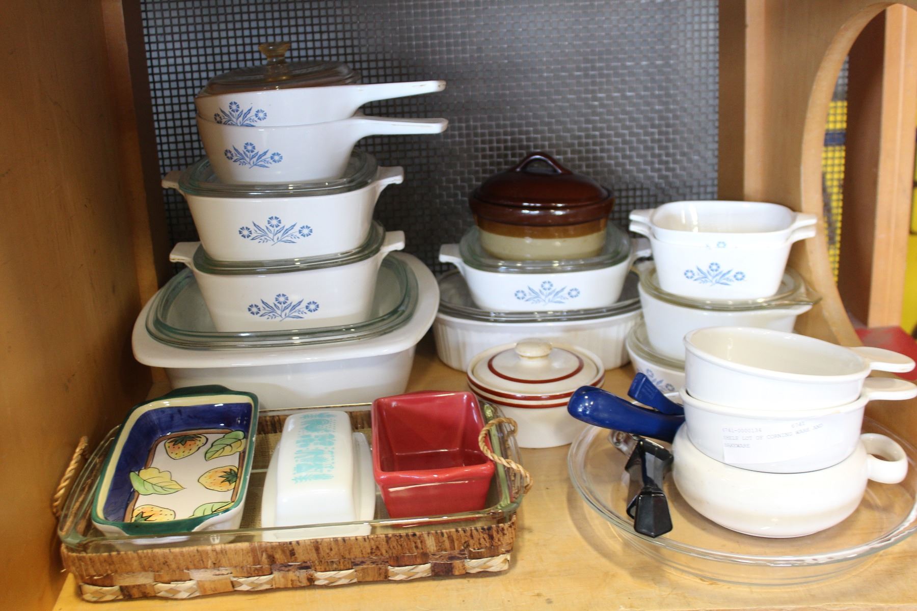 SHELF LOT OF CORNING WARE AND BAKEWARE