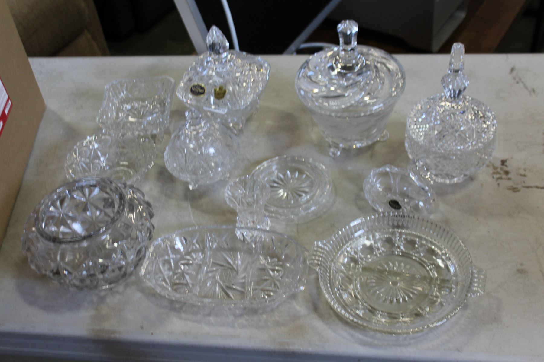 SHELF LOT OF CRYSTAL LIDDED DISHES ETC