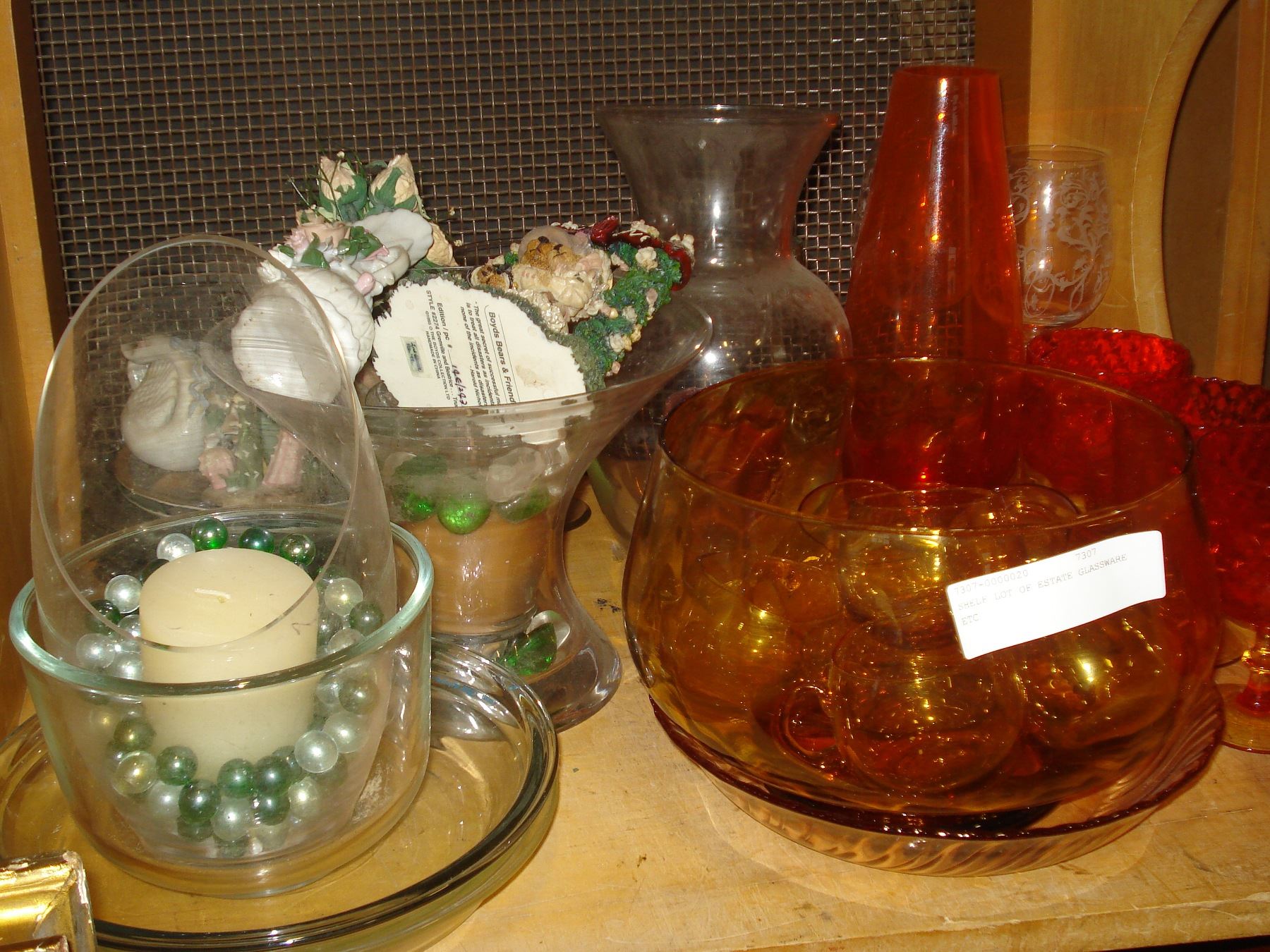 SHELF LOT OF ESTATE GLASSWARE ETC