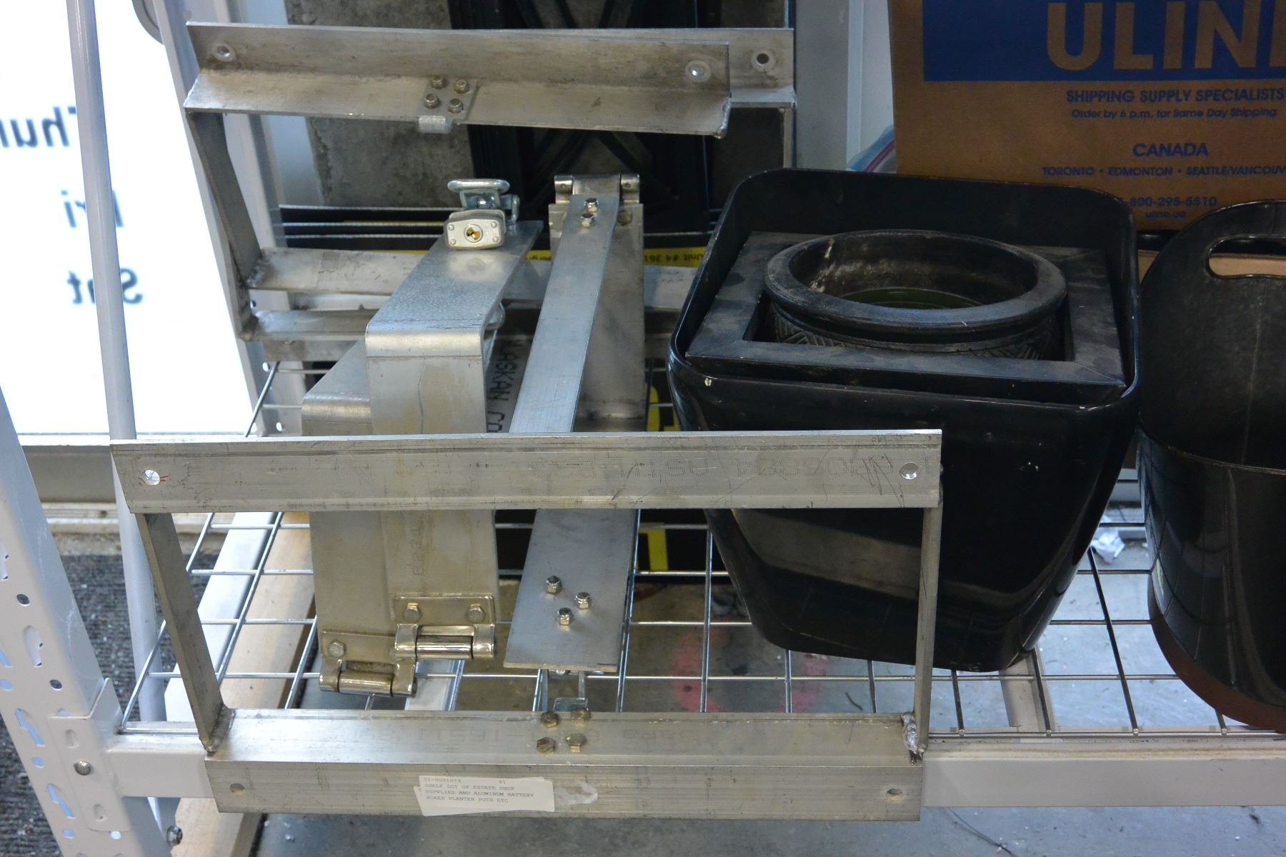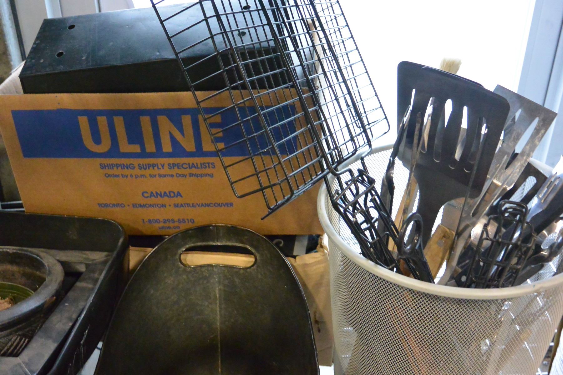 SHELF LOT OF ESTATE SHOP SUPPLIES AND ALUMINUM BATTERY BOXES PLANTER POTS ETC
