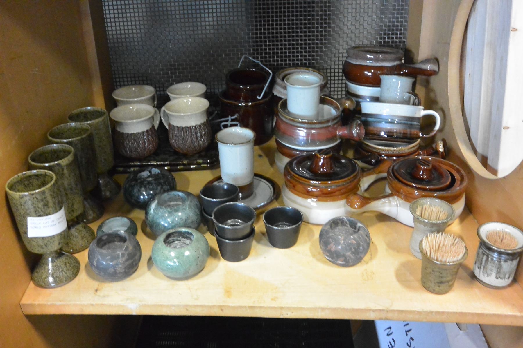 SHELF LOT OF FRENCH ONION SUOP BOWLS POTTERY MUGS ETC