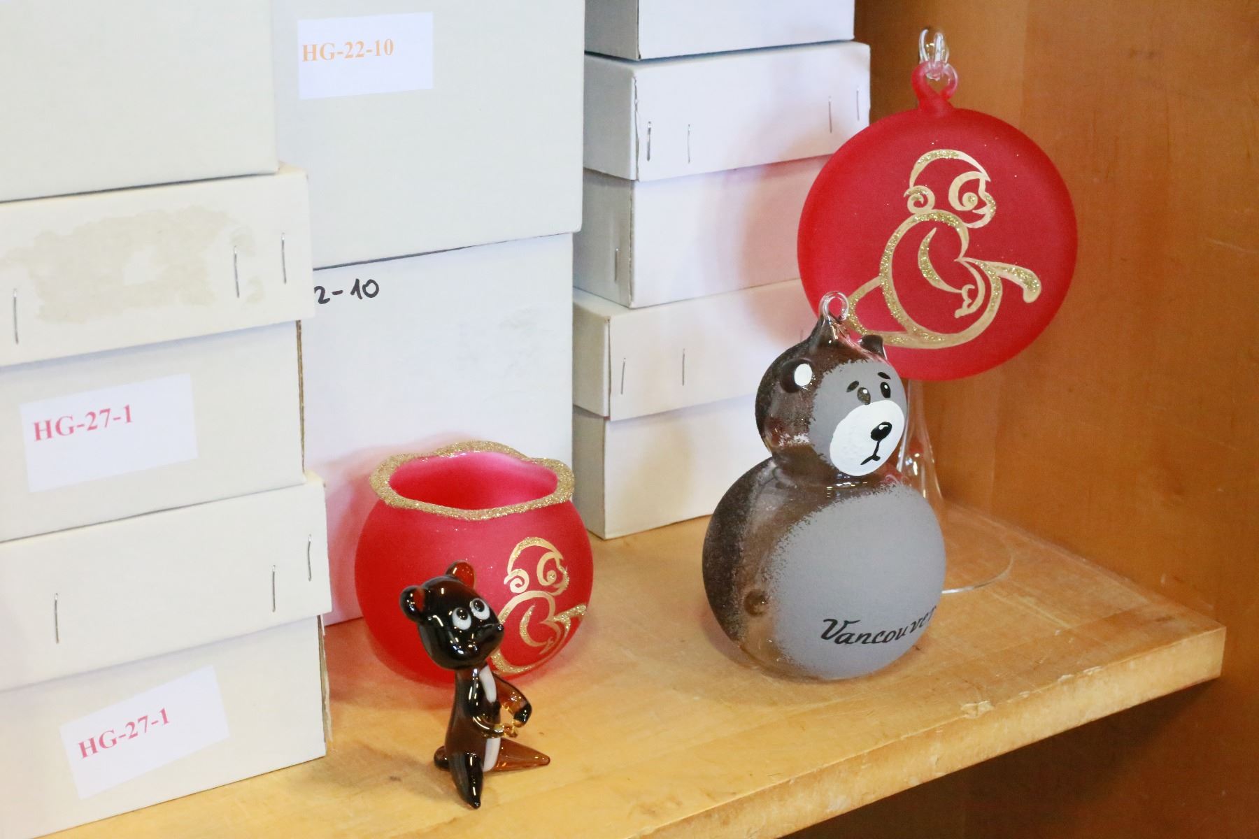 SHELF LOT OF HAND BLOWN GLASS MONKEY AND BEAR MOTIF
