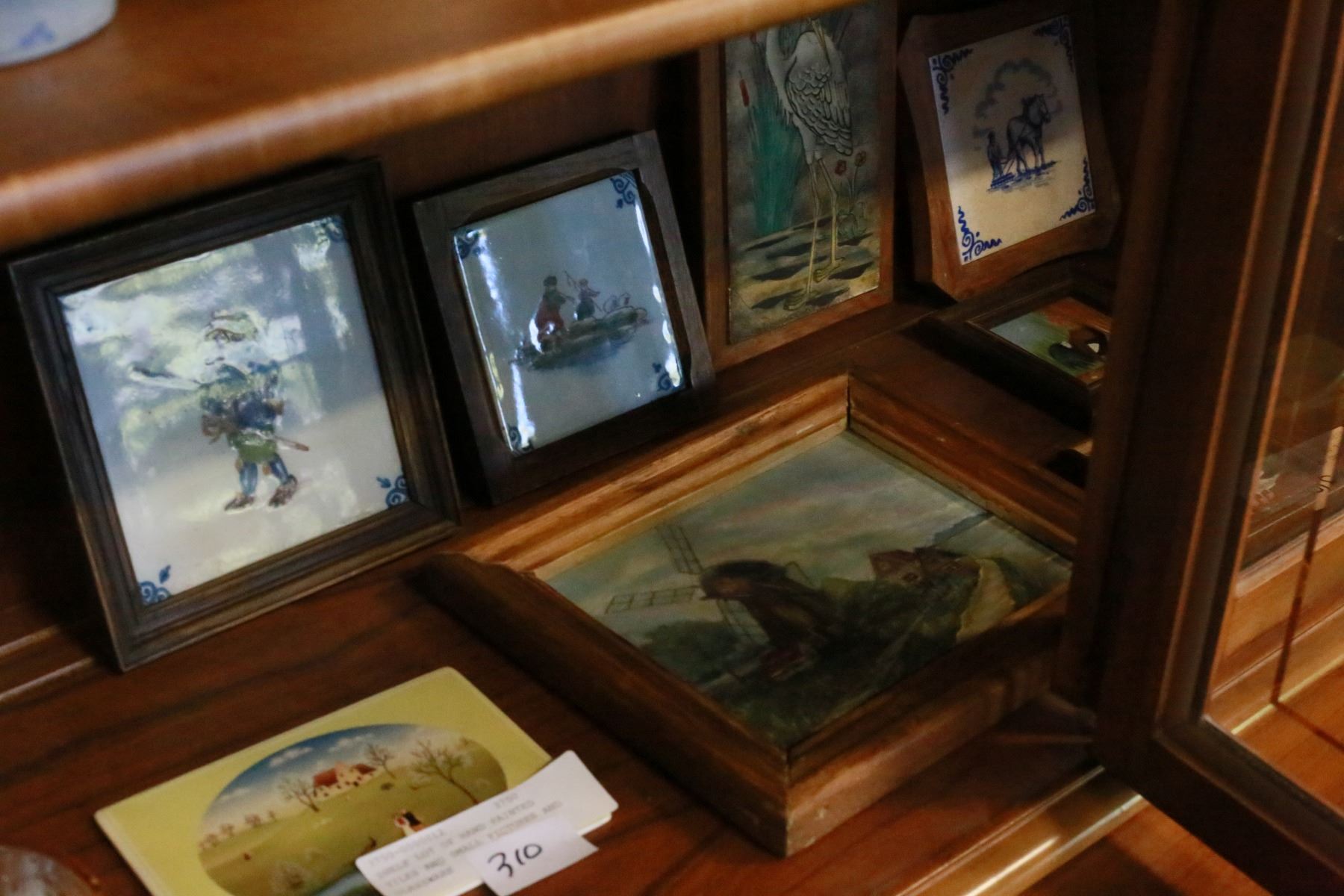 SHELF LOT OF HAND PAINTED TILES AND SMALL PICTURES AND GLASSWARE