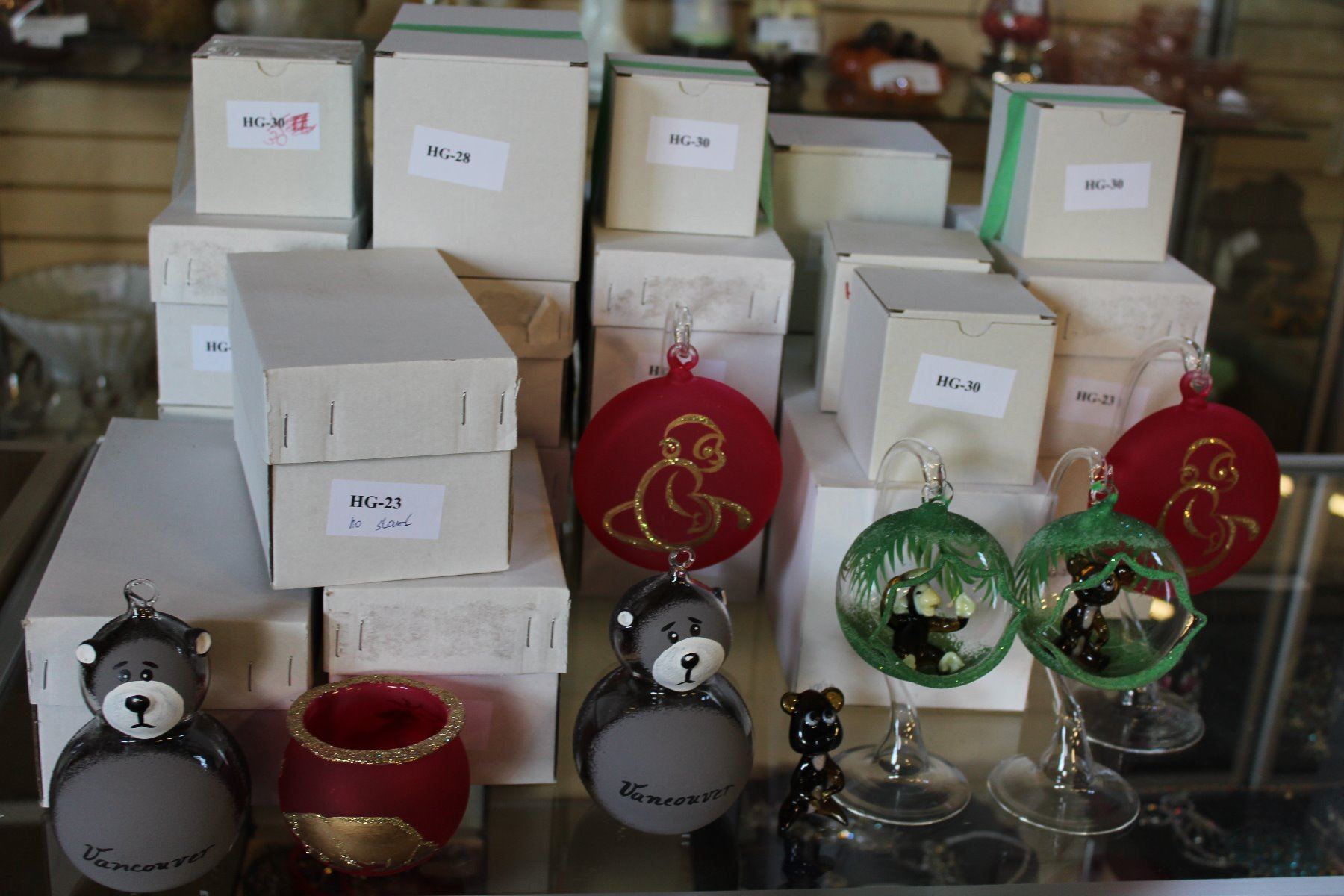 SHELF LOT OF HANDBLOWN MONEY, BEAR ORNAMENTS AND TEALIGHTS (MIXED)