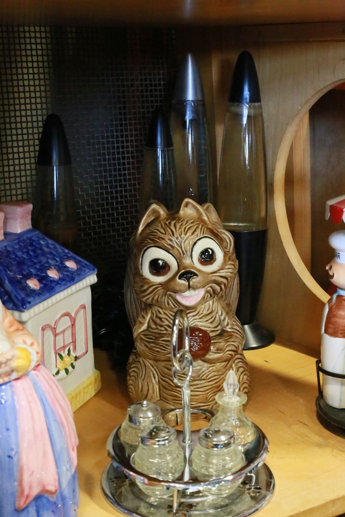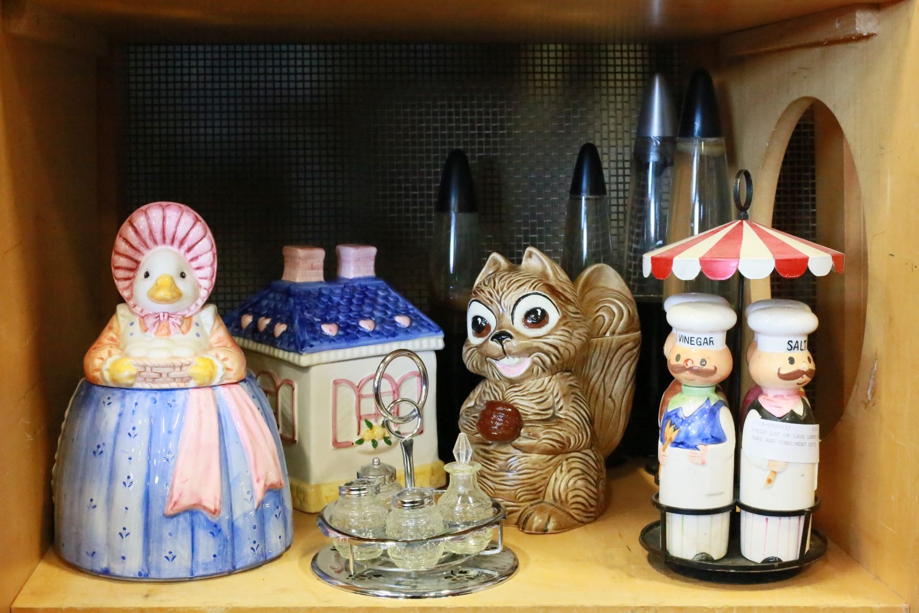 SHELF LOT OF LAVA LAMPS COOKIE JARS AND CONDIMENT SETS
