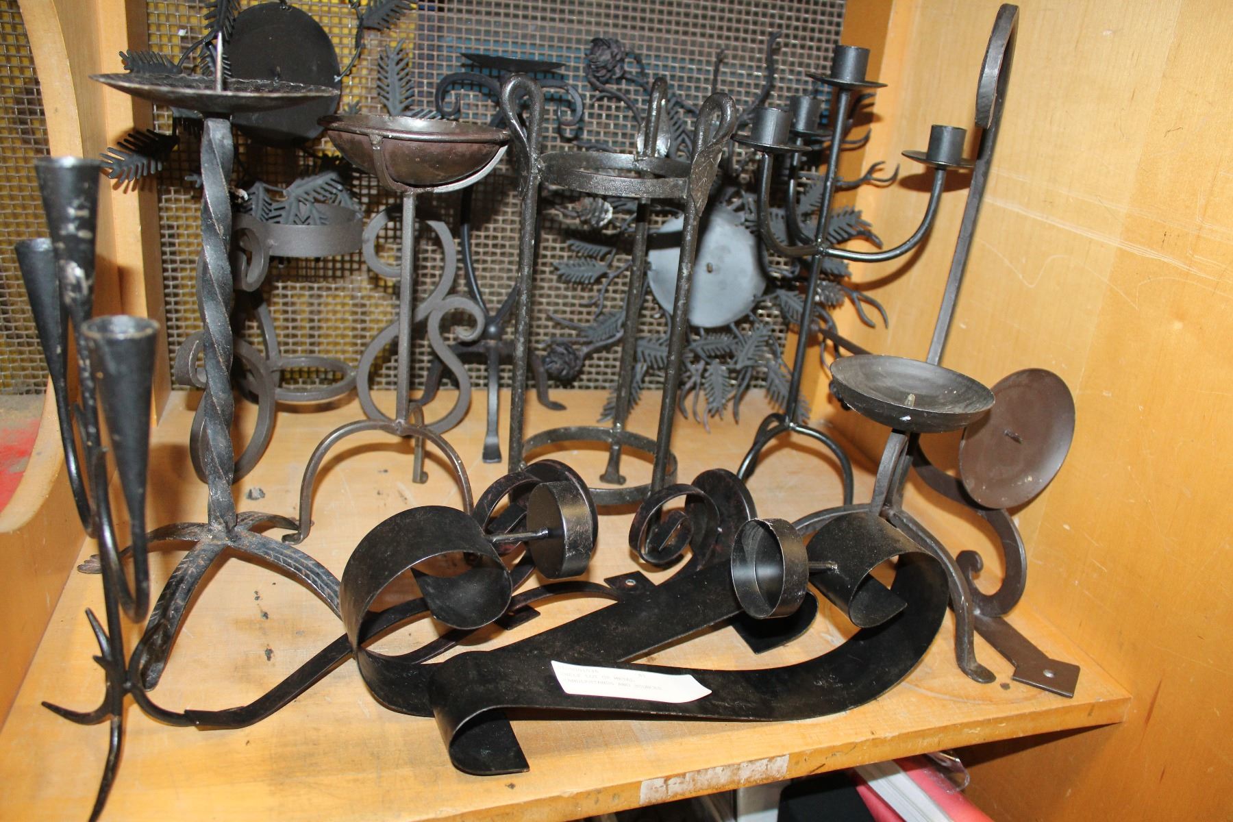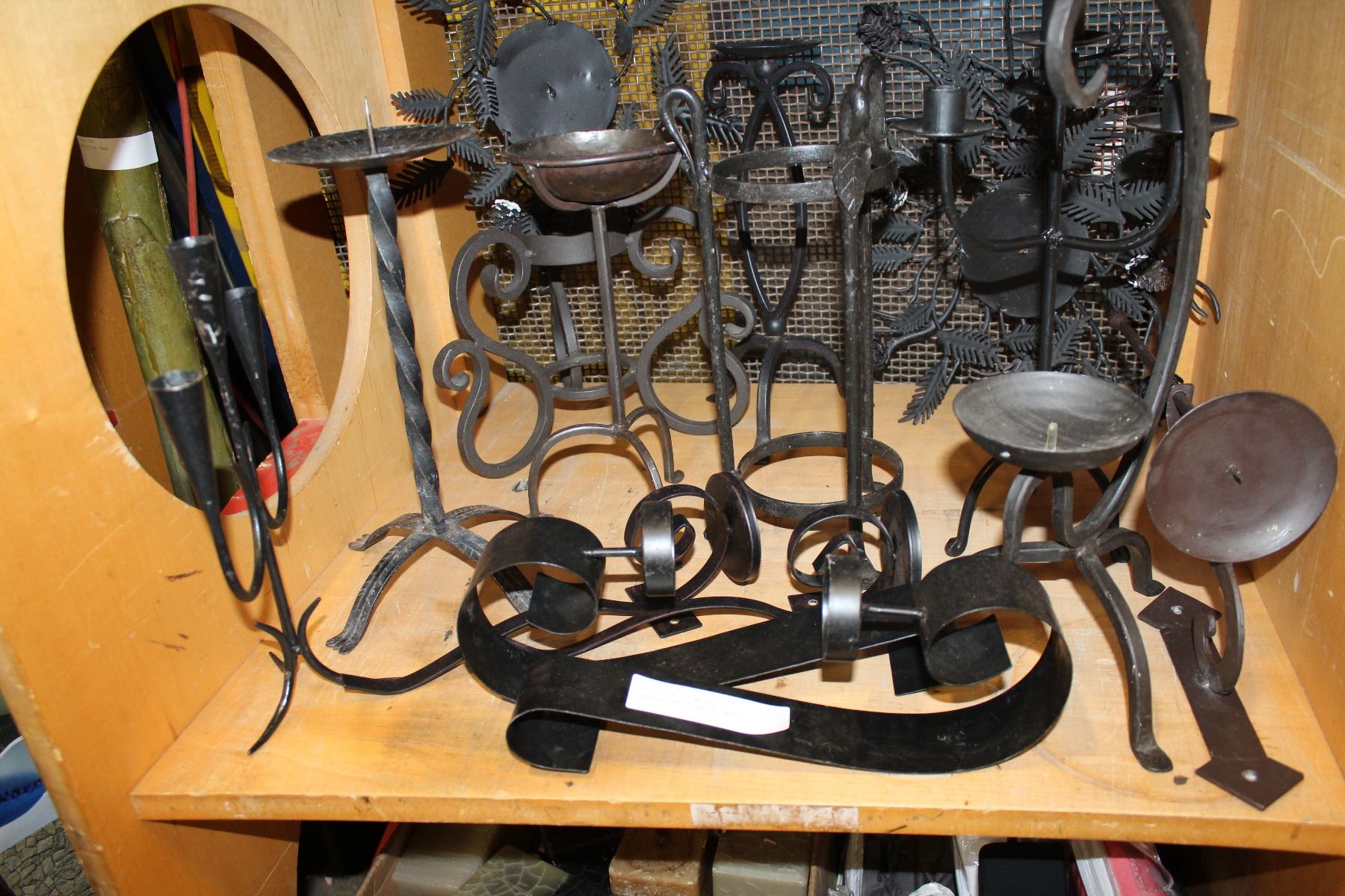 SHELF LOT OF METAL CANDLESTANDS AND SCONCES