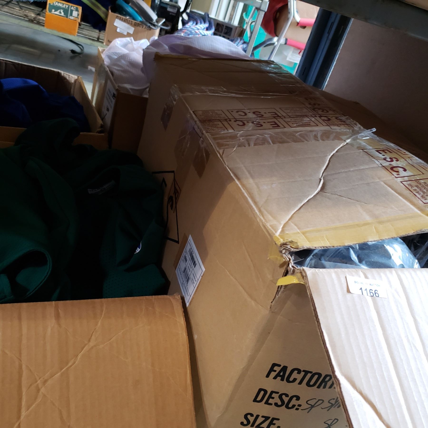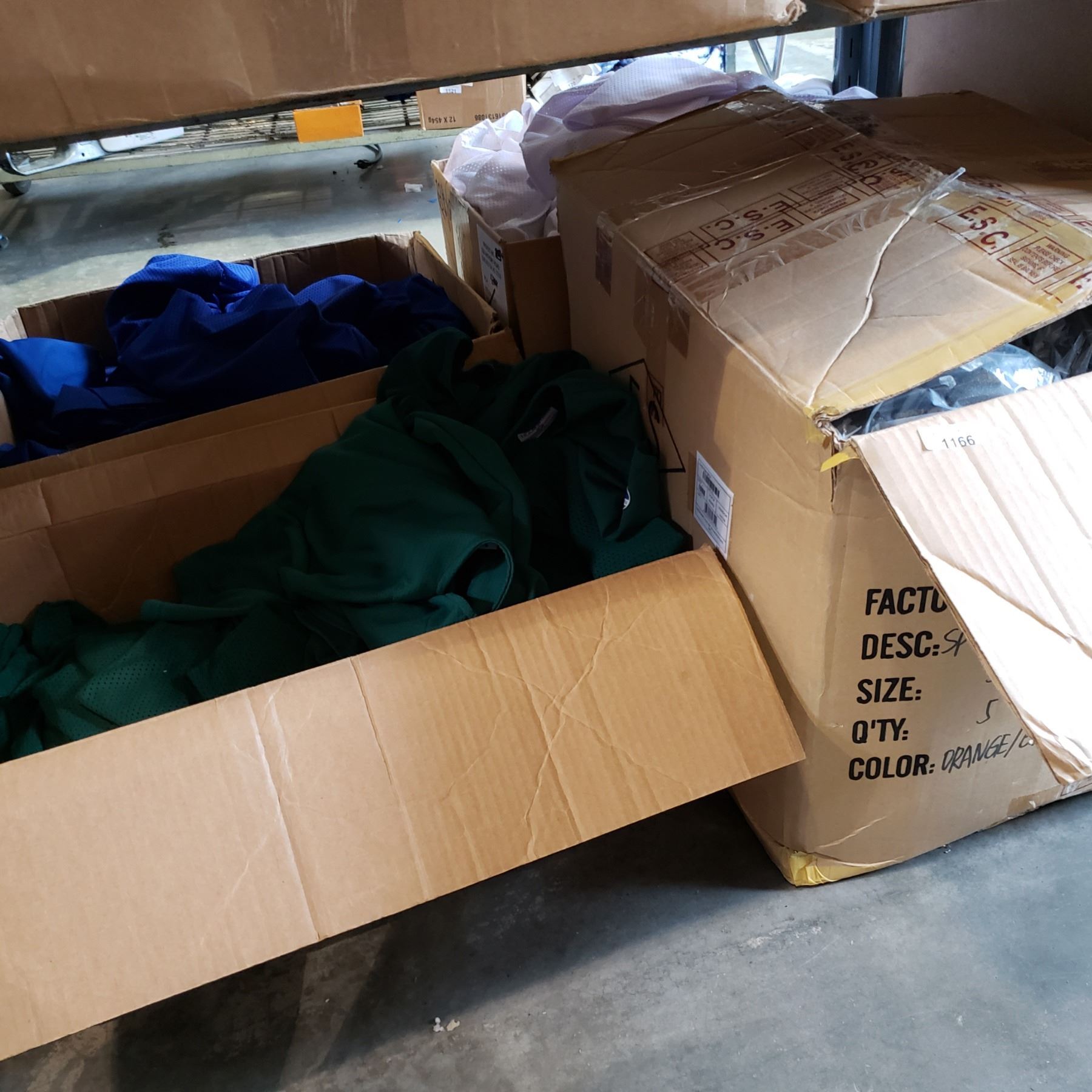 SHELF LOT OF NEW SPORTS JERSEYS AND HELMET FOAM LINERS