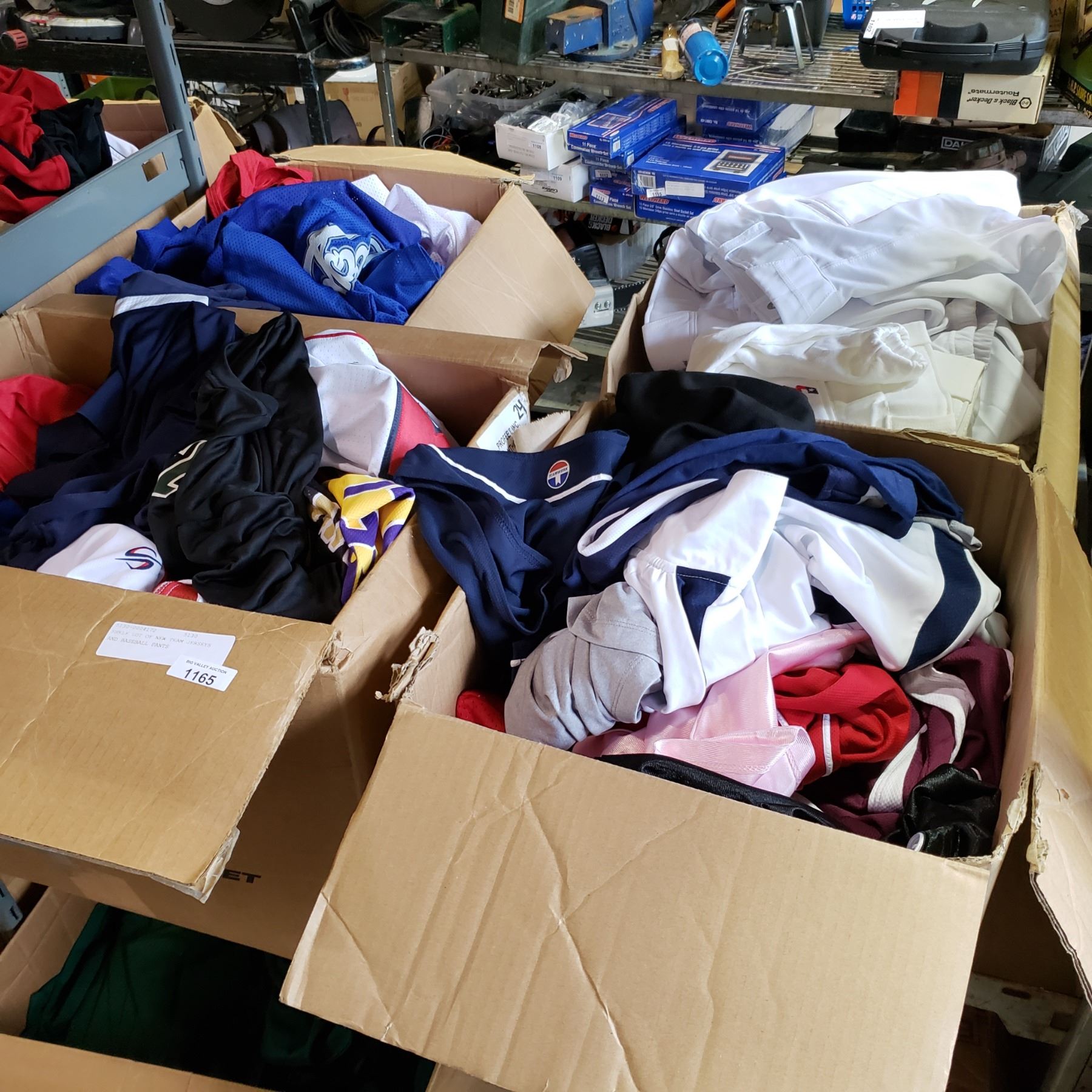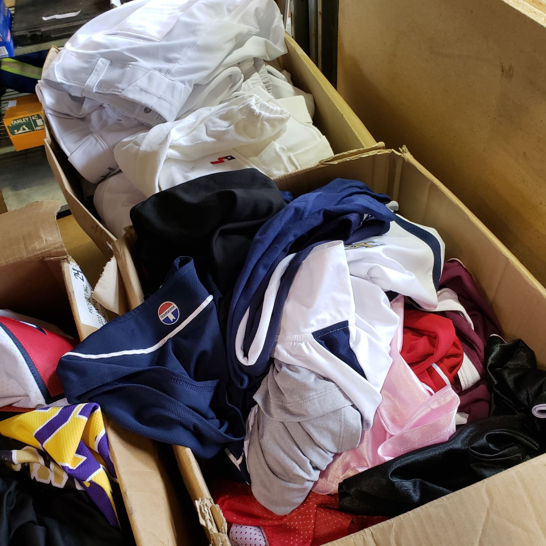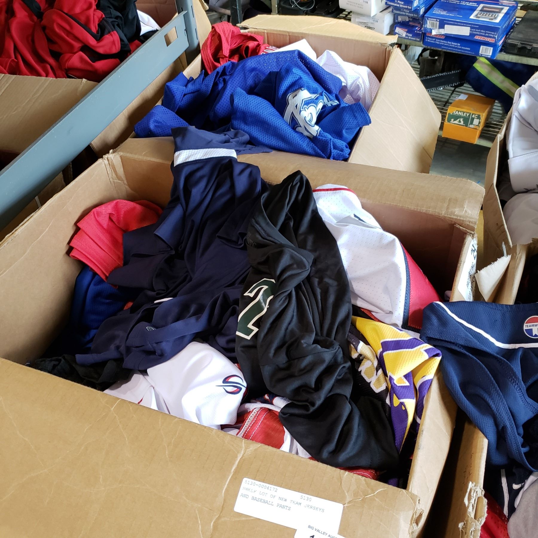 SHELF LOT OF NEW TEAM JERSEYS AND BASEBALL PANTS
