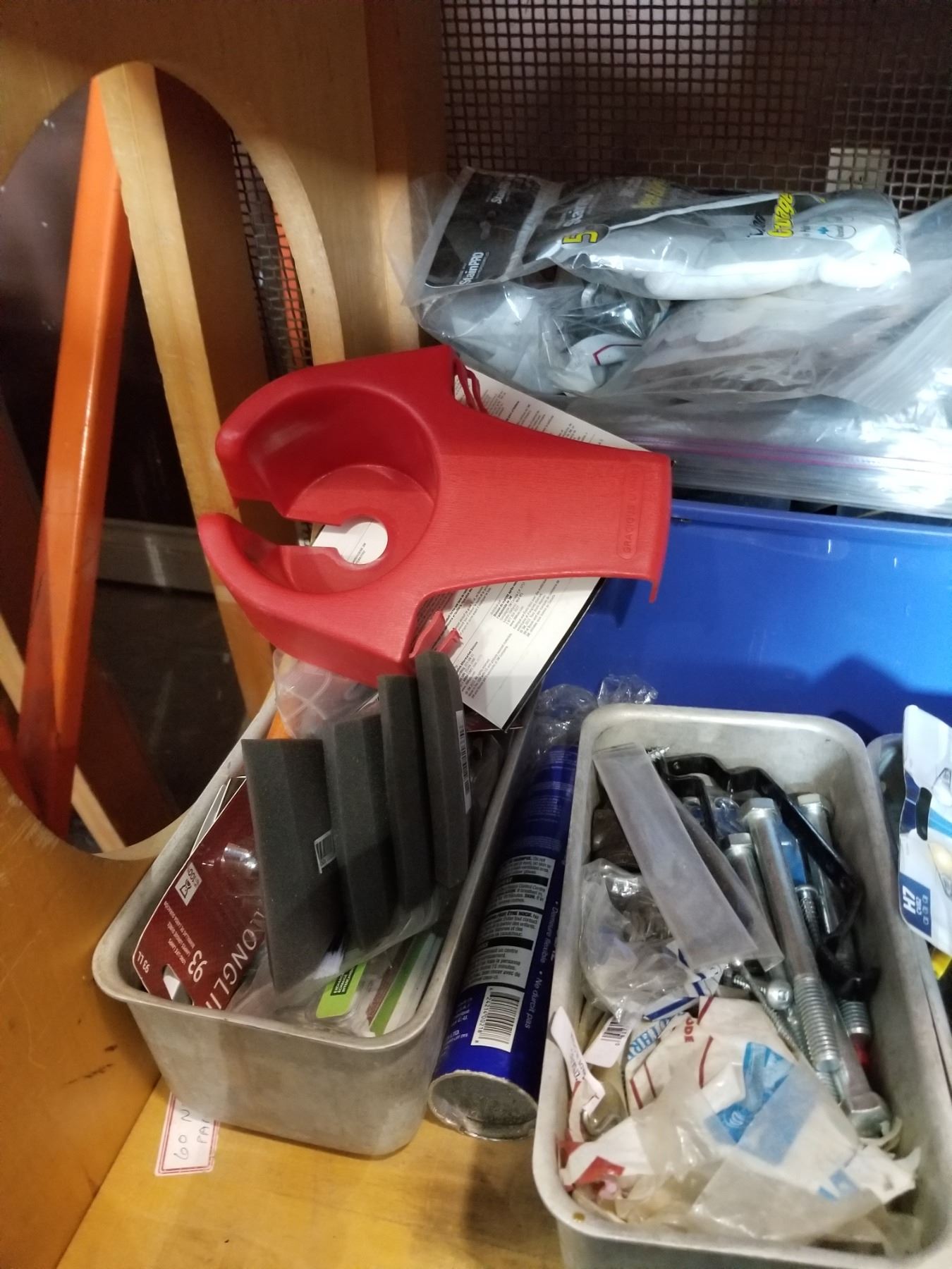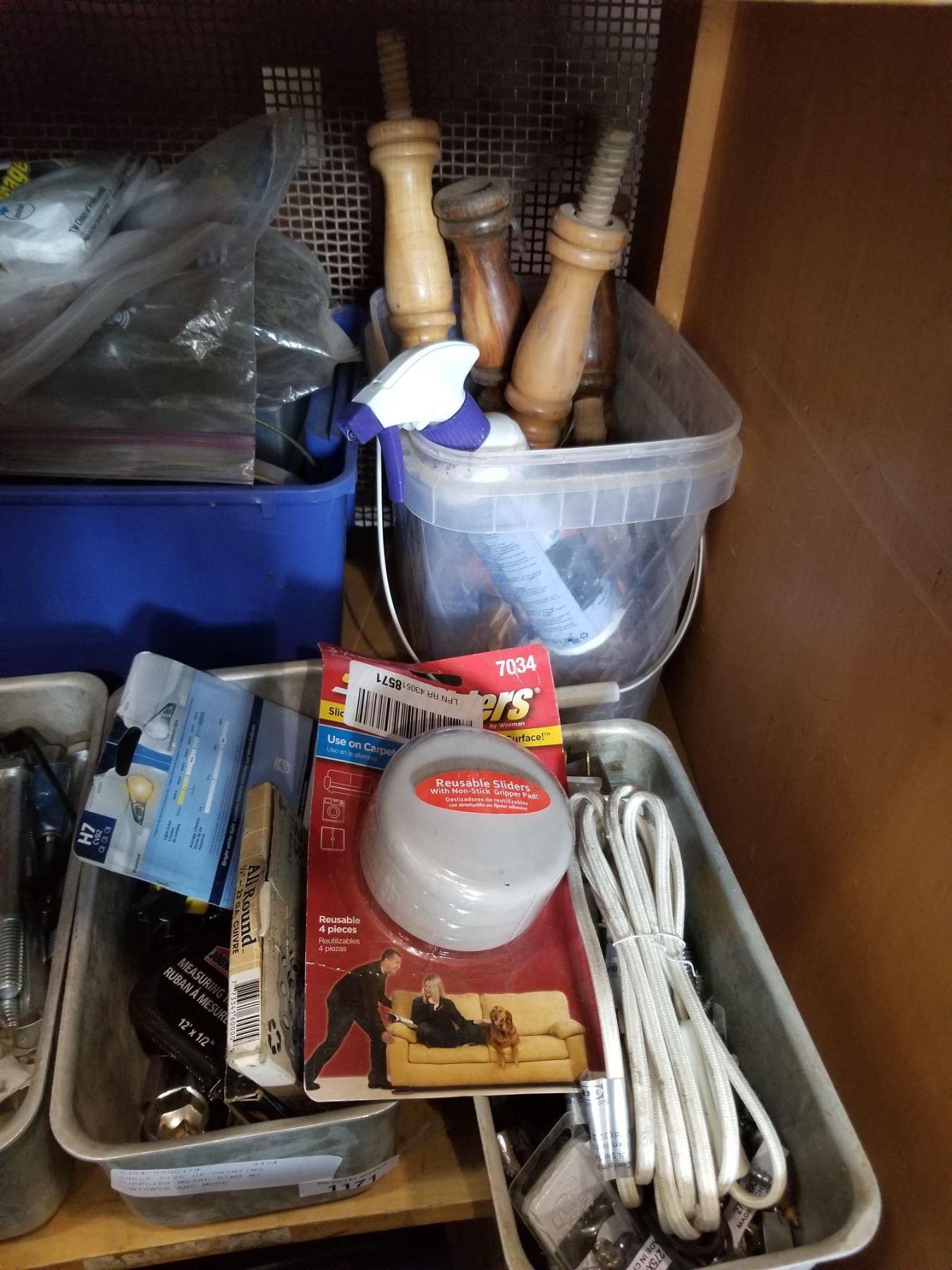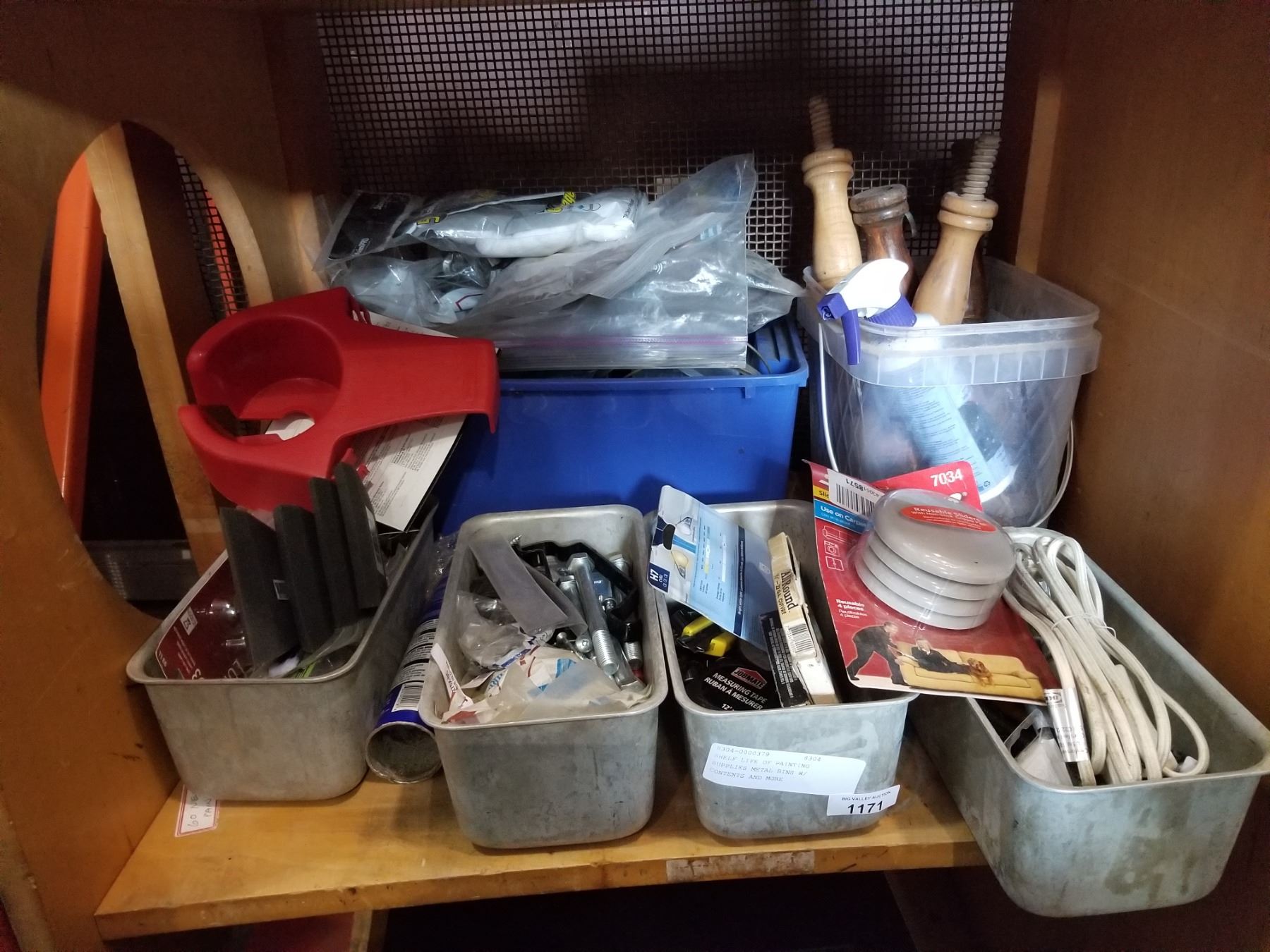 SHELF LOT OF PAINTING SUPPLIES METAL BINS W/ CONTENTS AND MORE