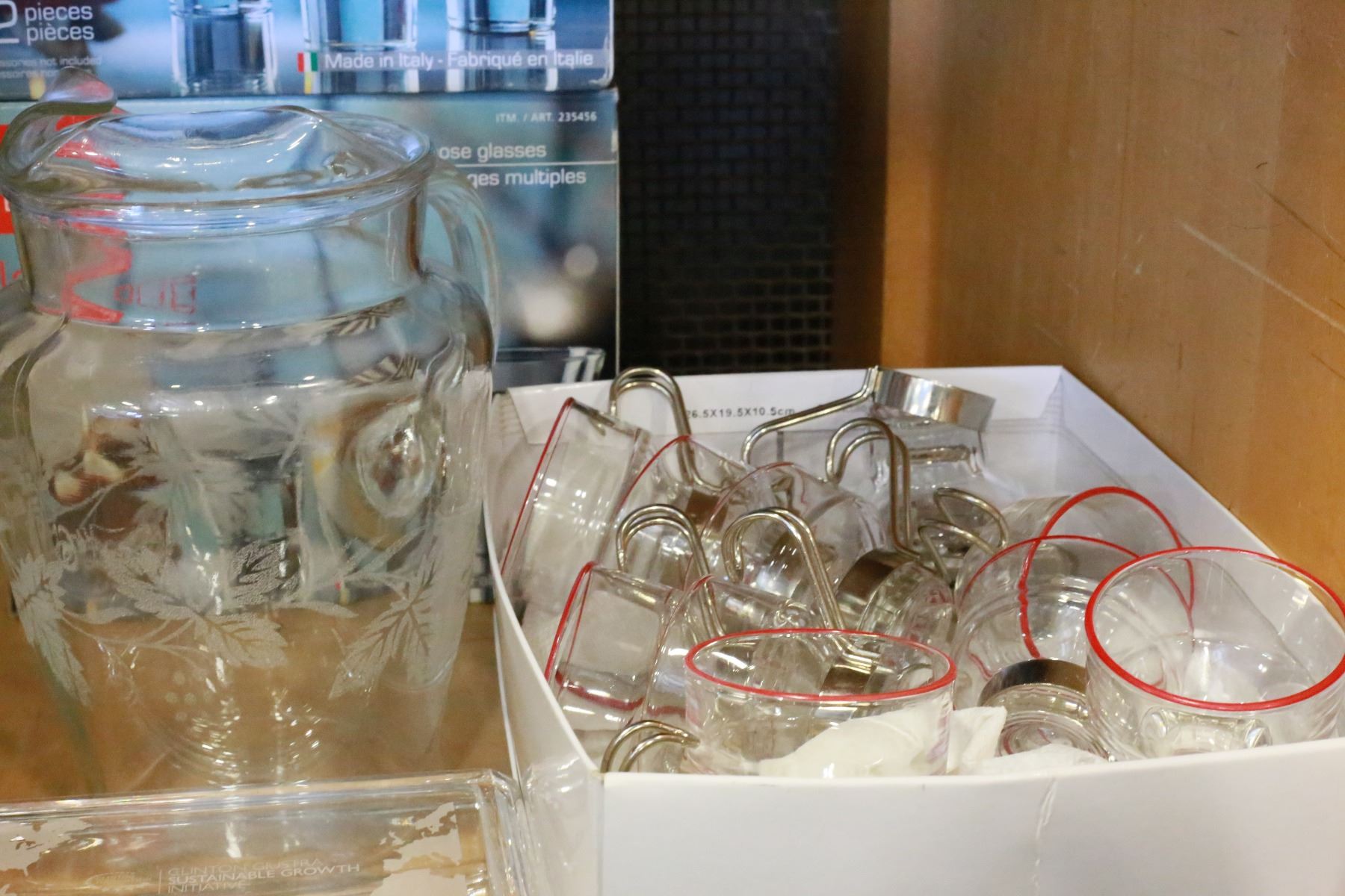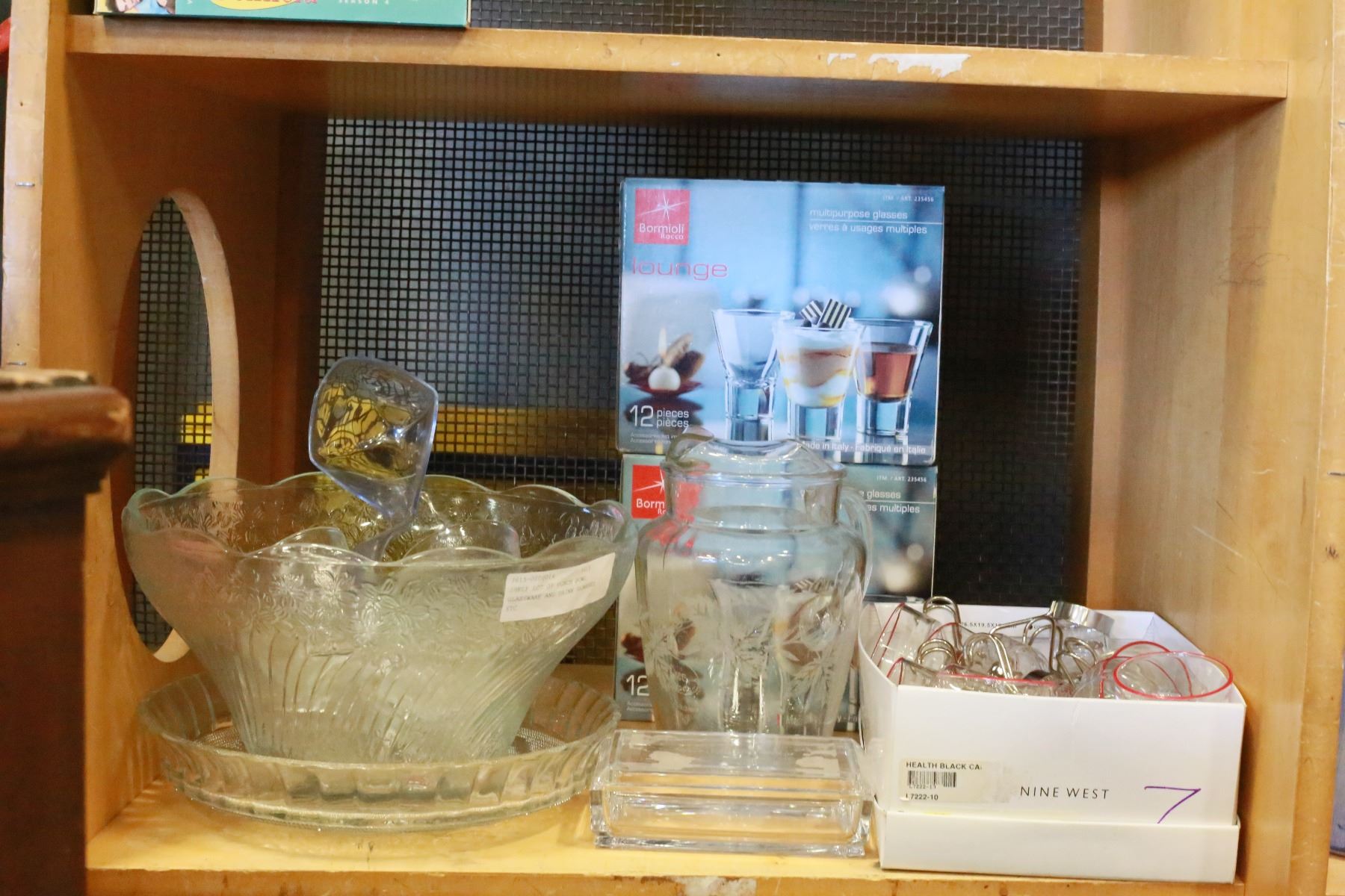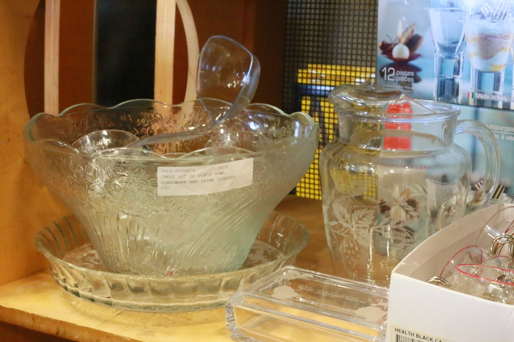 SHELF LOT OF PUNCH BOWL GLASSWARE AND DRINK GLASSES ETC