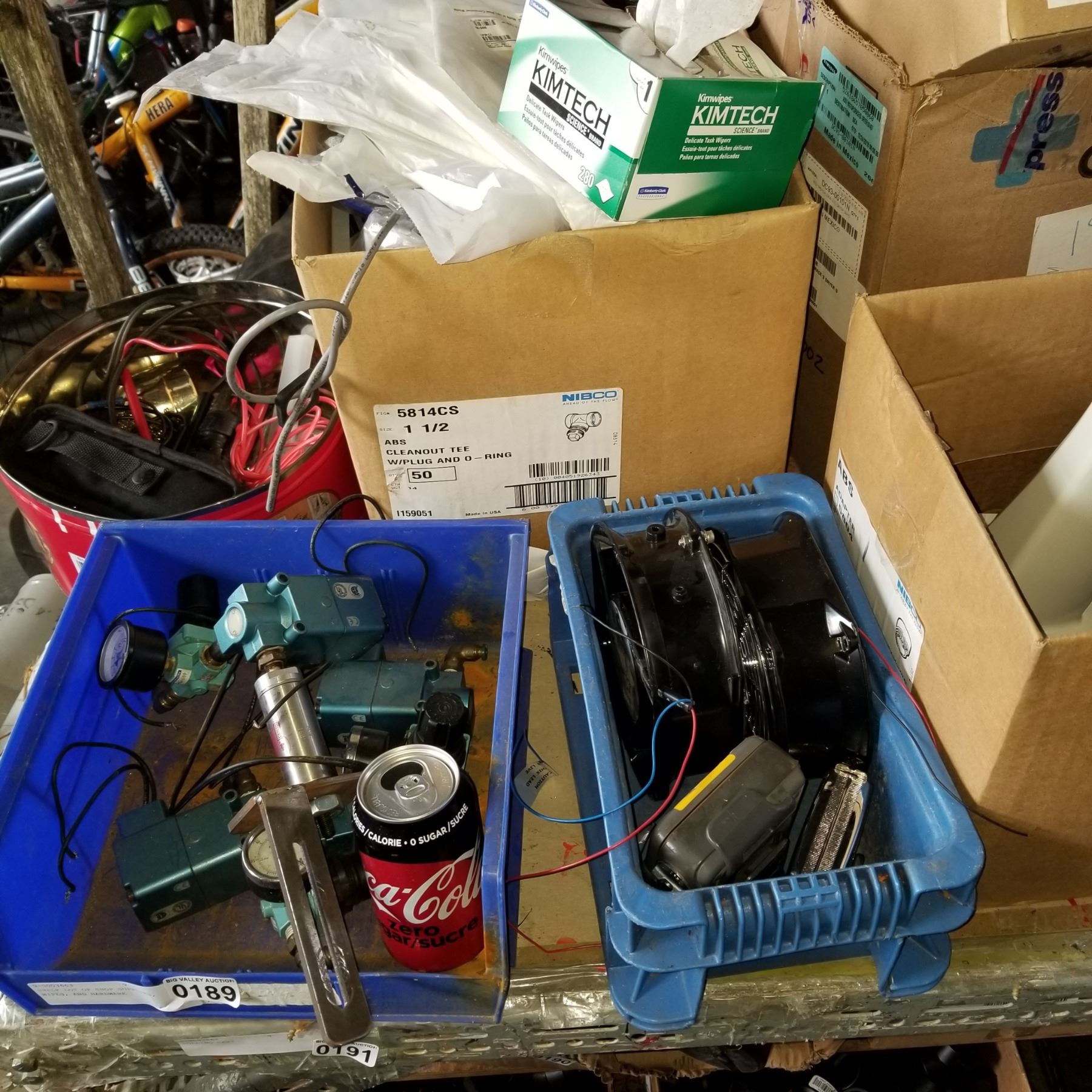 SHELF LOT OF SHOP SUPPLIES, WIPES, AND HARDWARE