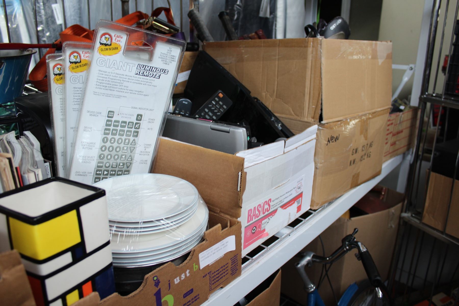SHELF LOT OF SPORTS ITEMS AND ELECTRONICS AND ESTATE GOODS