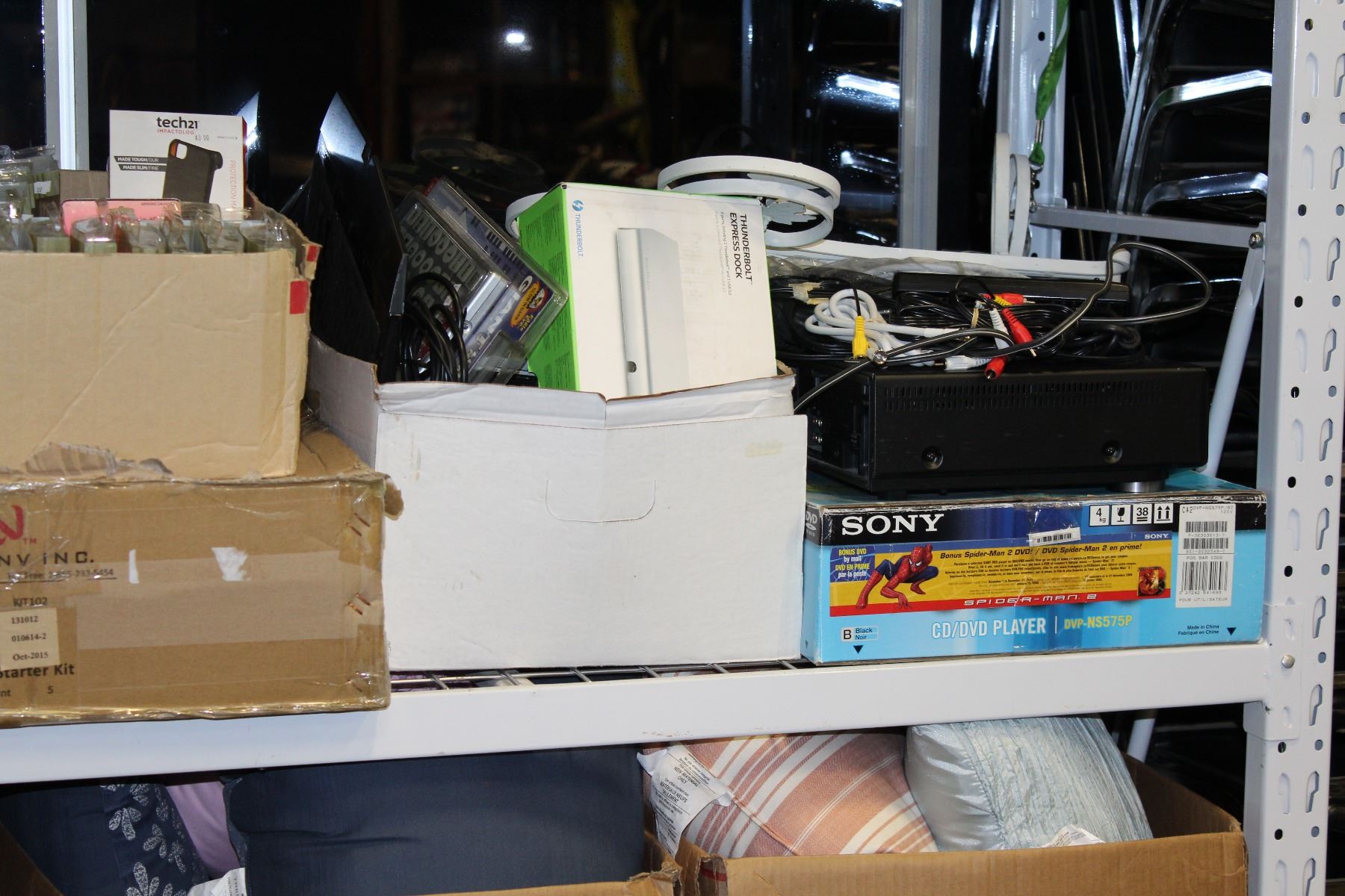 SHELF LOT OF SPORTS ITEMS AND ELECTRONICS AND ESTATE GOODS