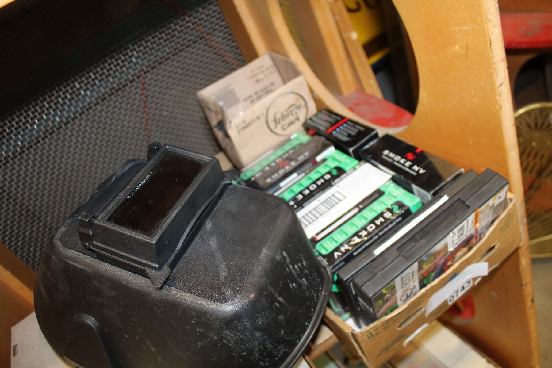 SHELF LOT OF TAPES WELDING HELMET ETC