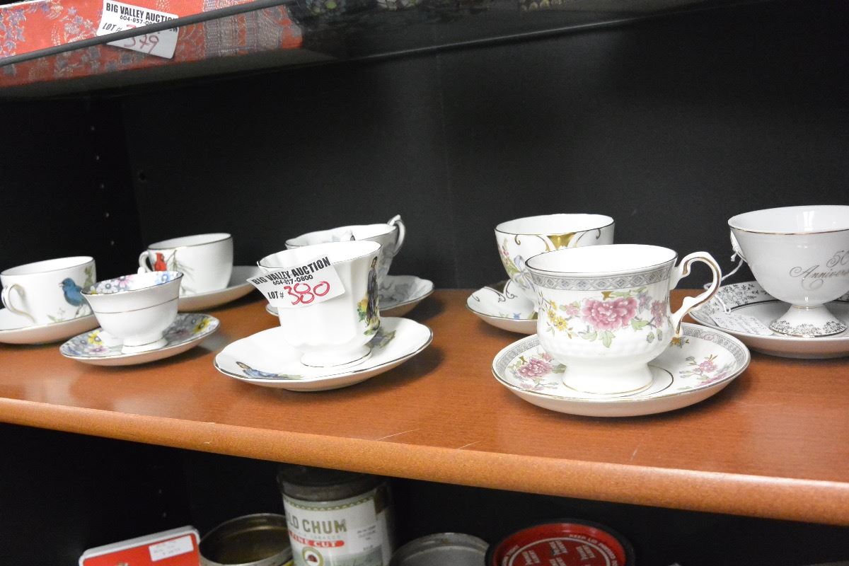 SHELF LOT OF TEA CUPS AND SAUCERS
