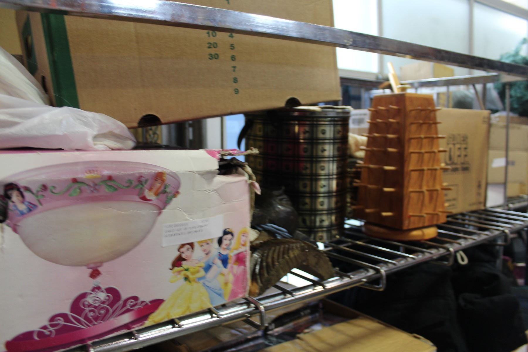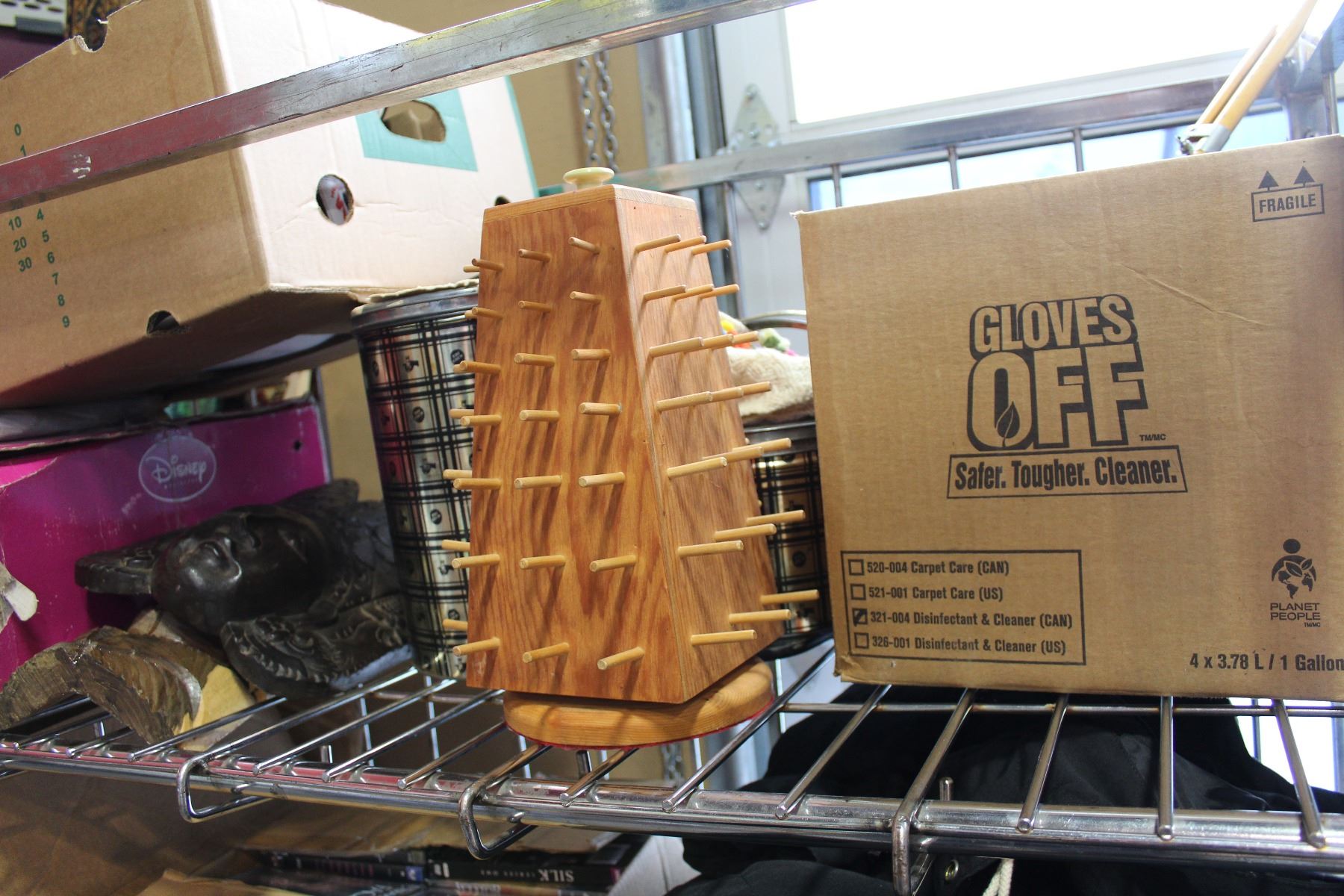 SHELF LOT OF TINS SEWING ACCESSORIES AND MASKS
