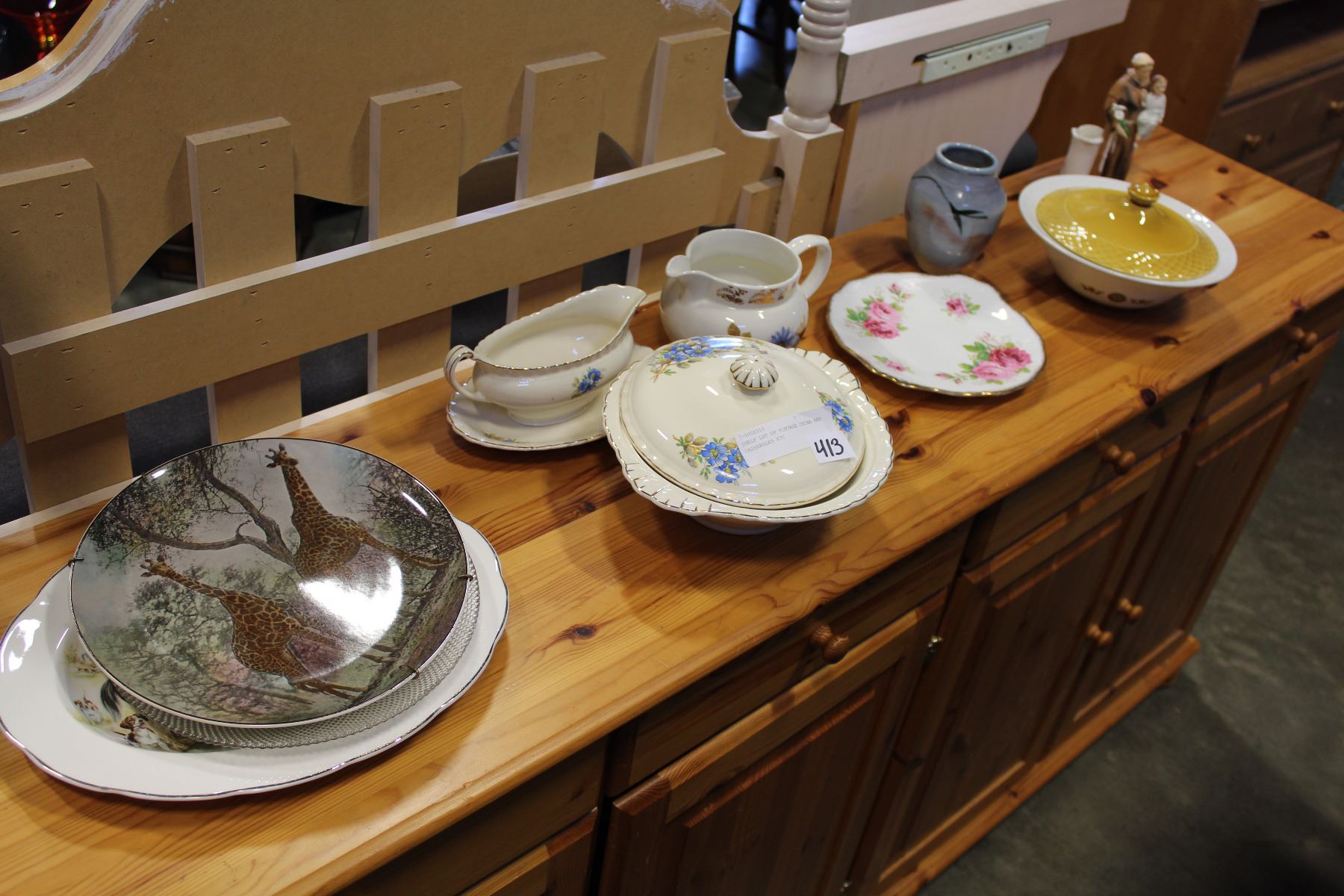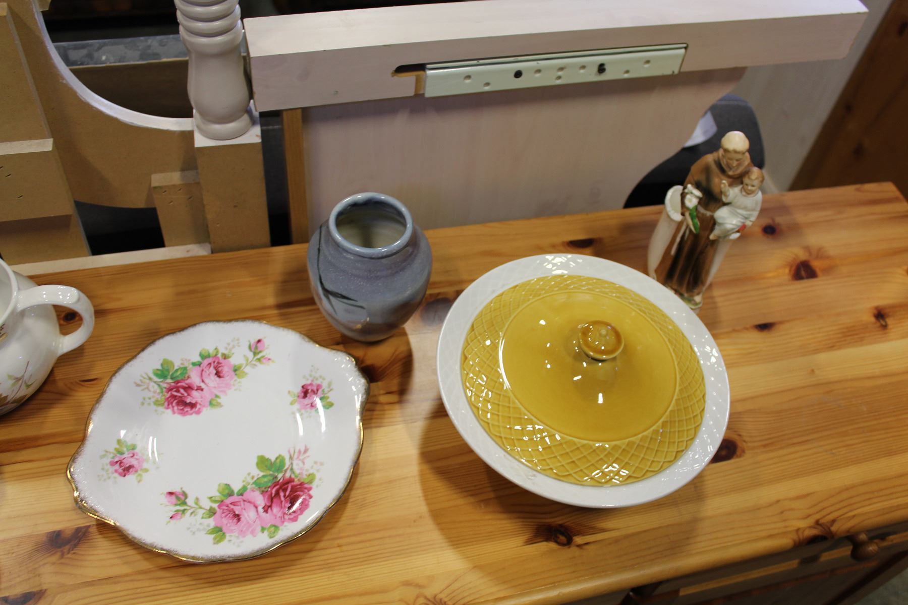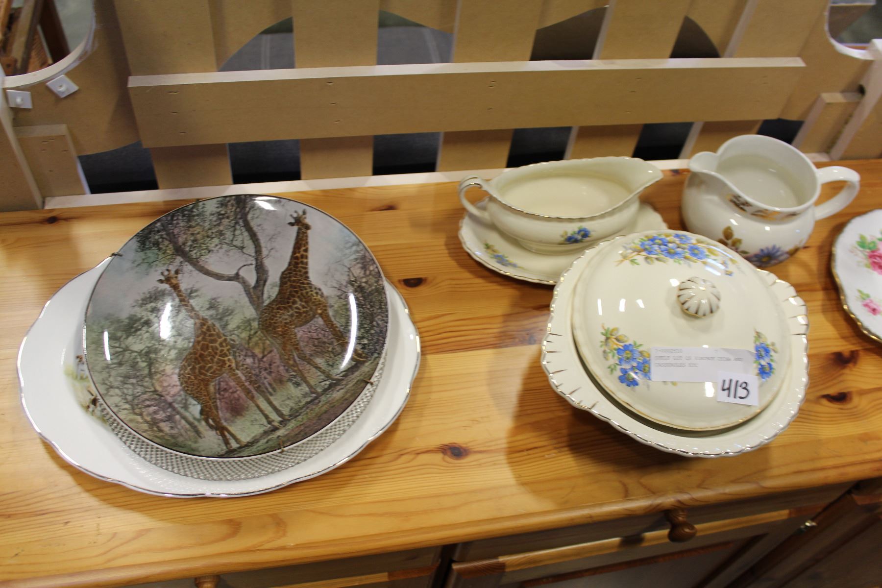 SHELF LOT OF VINTAGE CHINA AND CASSEROLES ETC