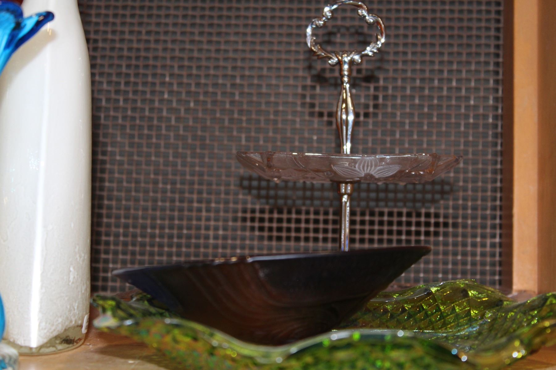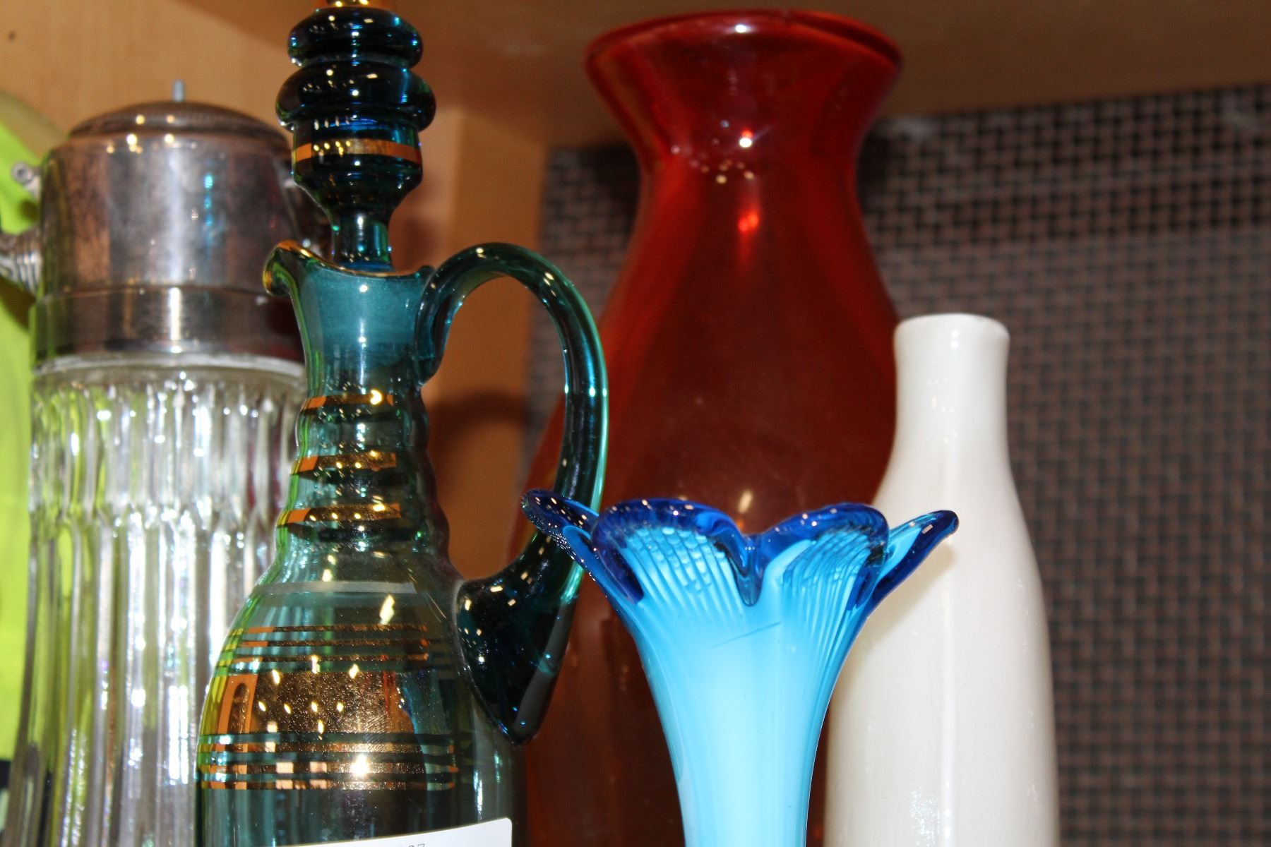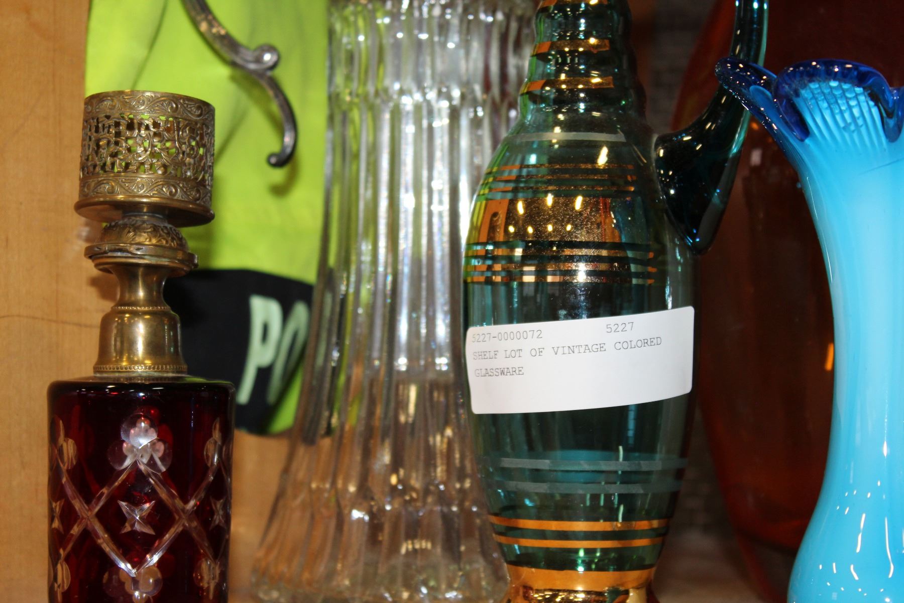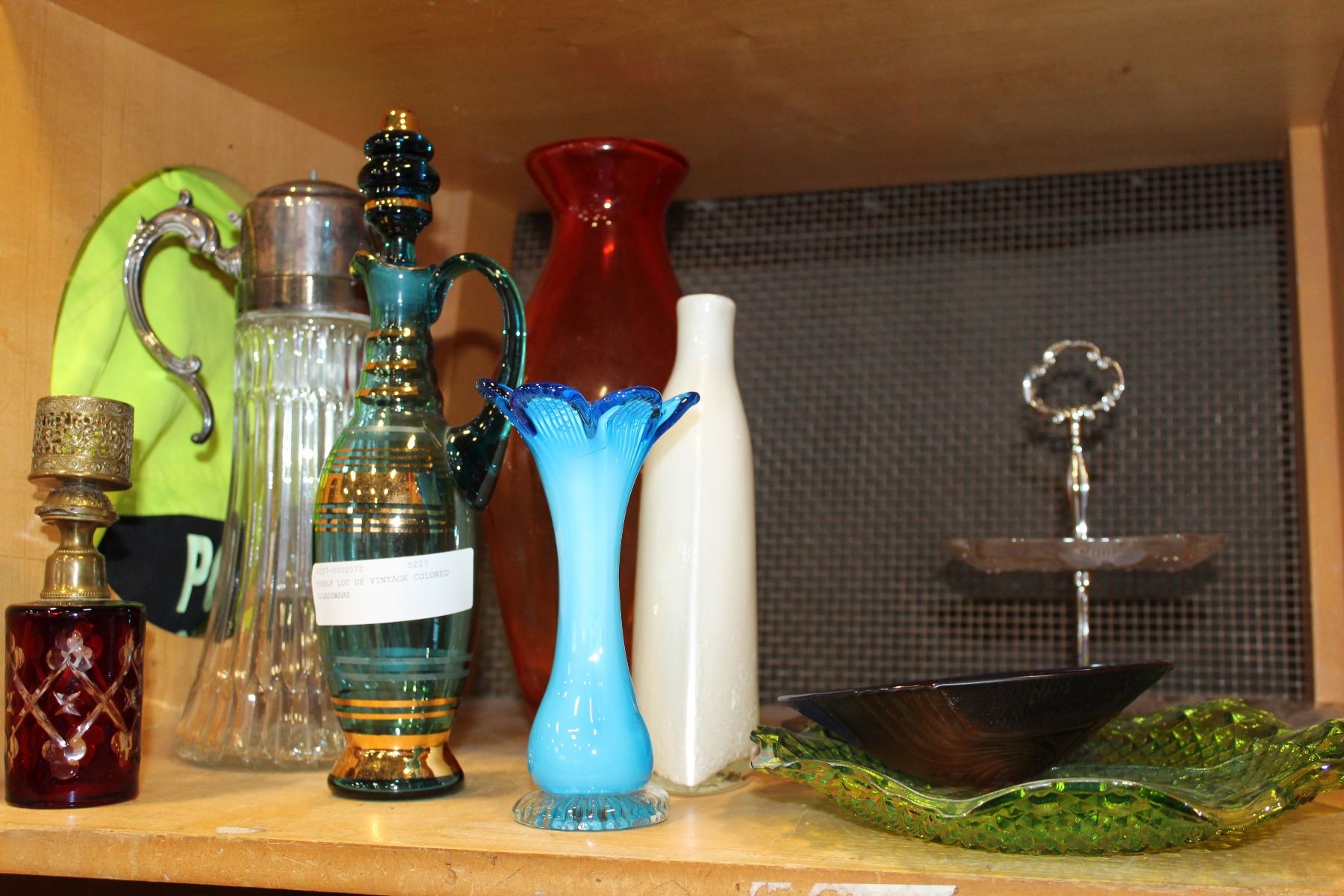 SHELF LOT OF VINTAGE COLORED GLASSWARE