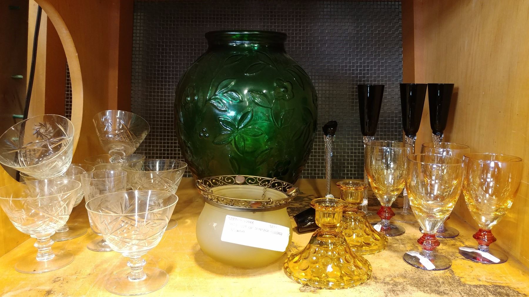 SHELF LOT OF VINTAGE COLORED GLASSWARE