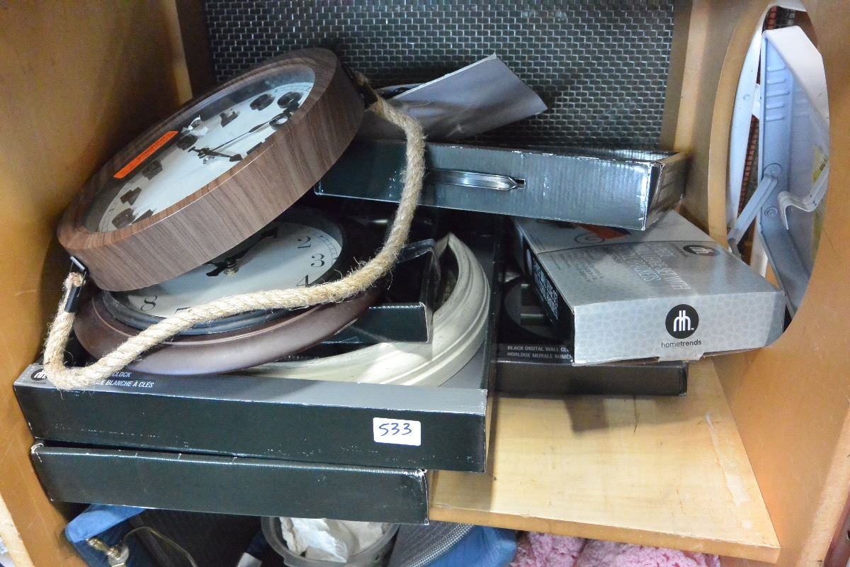 SHELF LOT OF WALL CLOCKS AND WALL ART
