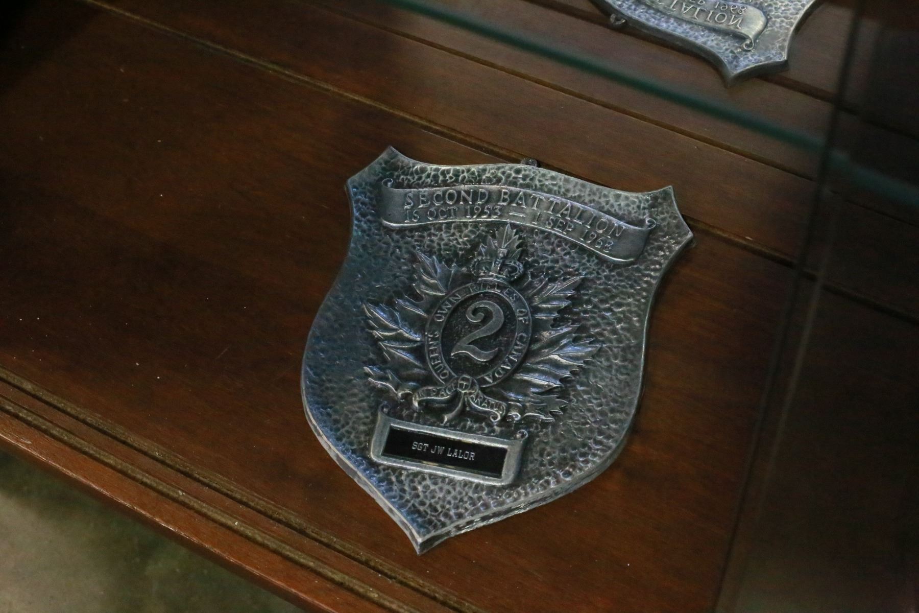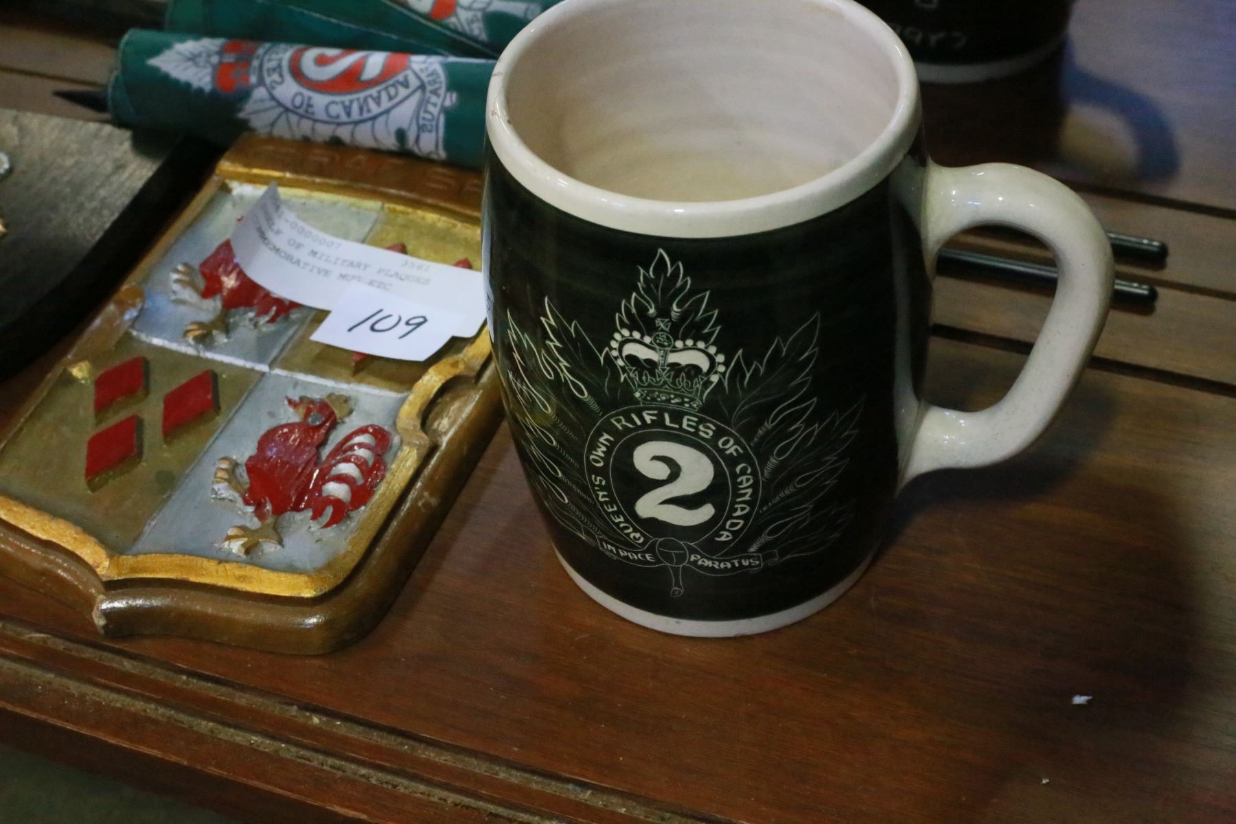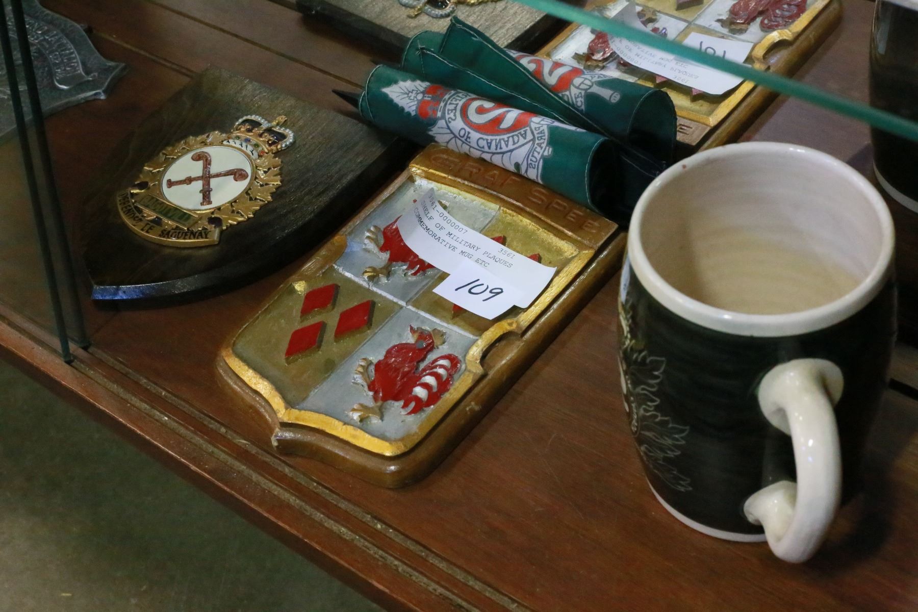 SHELF OF MILITARY PLAQUES COMMEMORATIVE MUG ETC