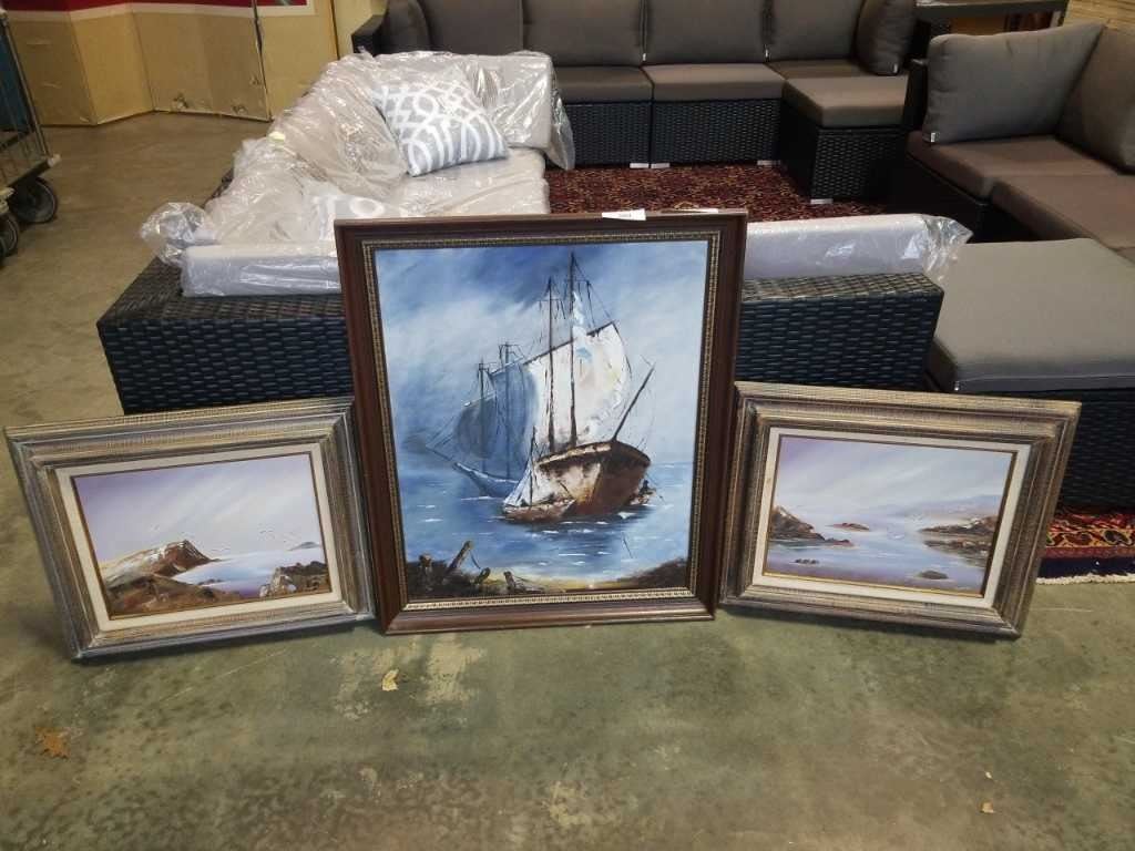 SHIP AND 2 BEACH PAINTINGS ON CANVAS