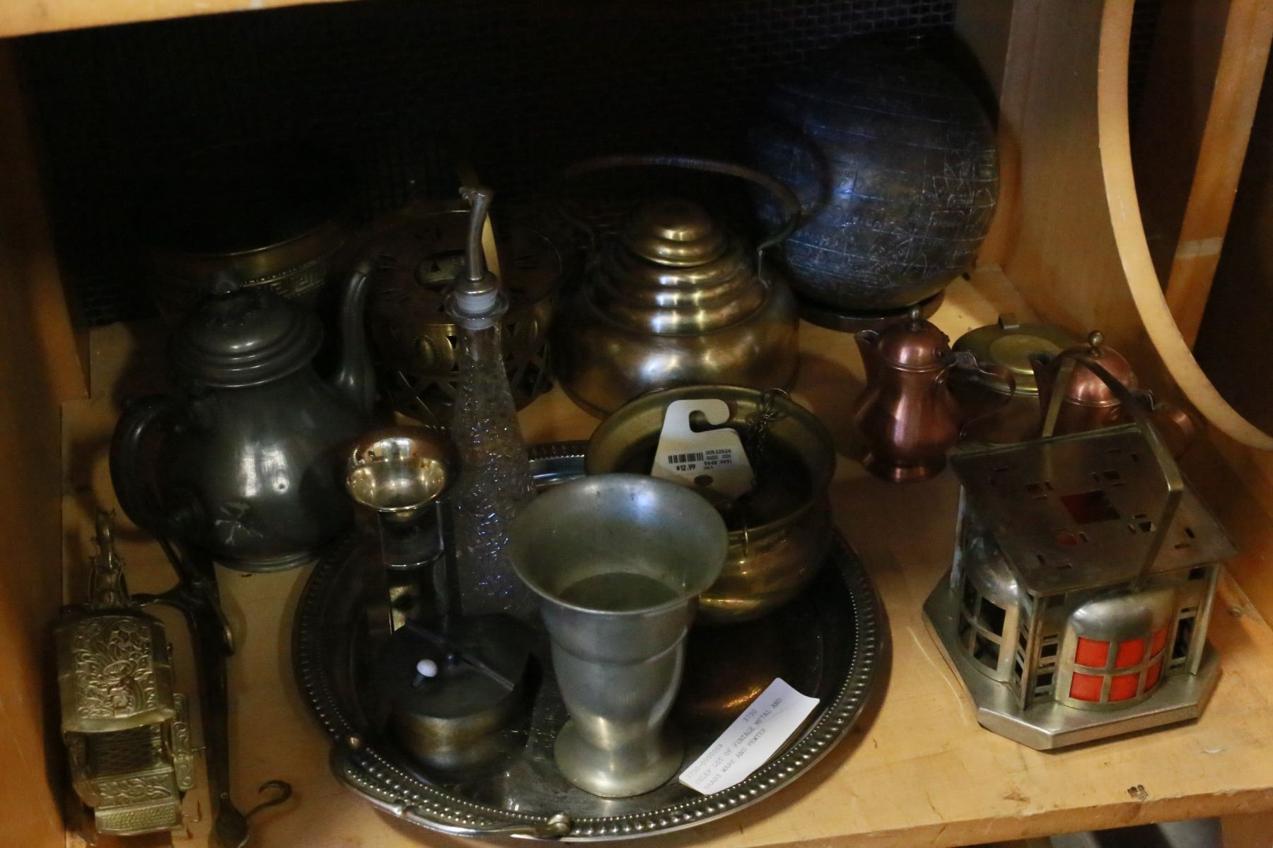SHLEF LOT OF VINTAGE METAL AND BRASS WARE AND PEWTER
