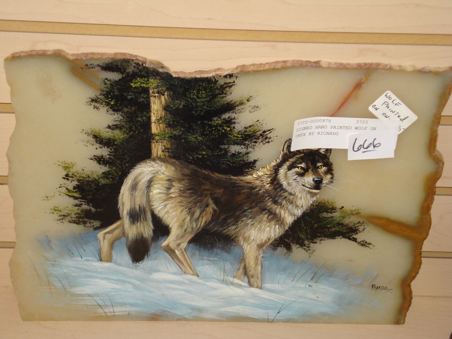 SIGNED HAND PAINTED WOLF ON ONYX BY RICARDO