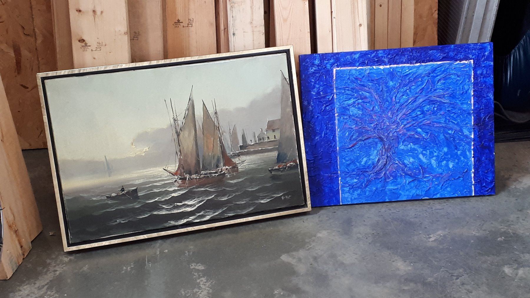 SIGNED OIL ON CANVAS "THE HARBOUR" AND BLUE ACRYIC TREE OF LIFE"