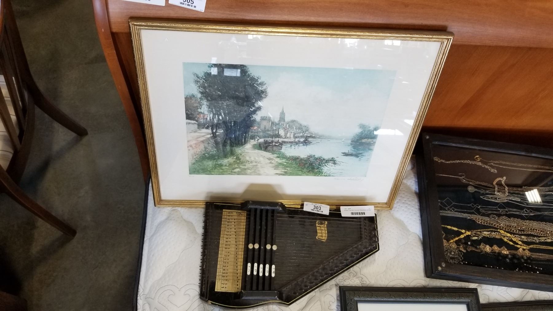 SIGNED WATER COLOUR FRANZISCA LEWIS AND AUTO HARP