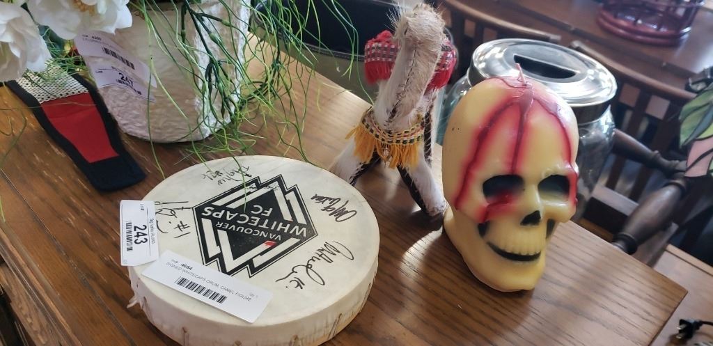 SIGNED WHITECAPS DRUM, CAMEL FIGURE AND SKULL CANDLE