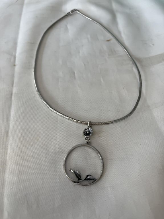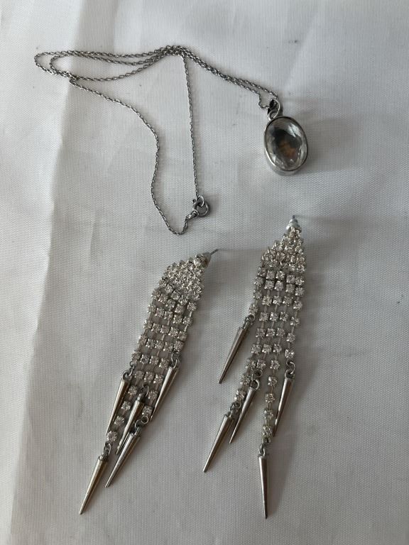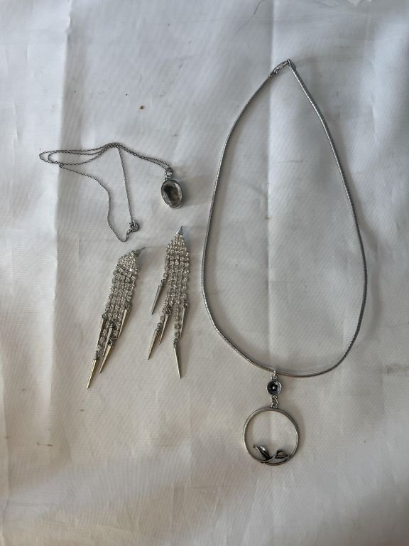 SILVER CHOKER BIB NECKLACE W/ PENDANT, CHANDELIER DANGLE EARRINGS AND CHAIN NECKLACE WITH PENDANT